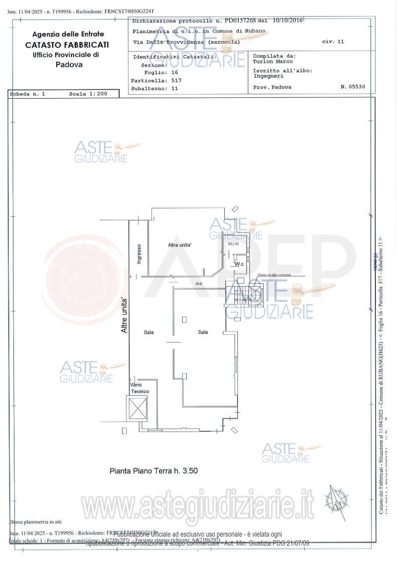 Vendita all'asta Senza incanto, con gara telematica sincrona - LOTTO 4: Lotto 4 - piena proprietà di unità immobiliare adibita a "sala giochi", facente parte del fabbricato condominiale sito in Comune di Rubano (PD), località Sarmeola, via Della Provvidenza con ingresso dai civici nn. 13 e 15 e precisamente consiste in una sala giochi al piano terra (altezza interna ml. 3), un ripostiglio e due W.C. con antibagno per una superficie commerciale di mq. 212. Occupato con titolo. Prezzo base € 162.200,00 (offerta minima € 121.650,00). Data vendita 21/04/2026 ore 11:00. Giudice Rossi. Professionista delegato alla vendita Not. Michelangelo Casciano - Email "aste@apepnotai.it"; Tel. 049651228. Custode Giudiziario Apep - Email "visita@apepnotai.it"; Tel. 049651228. Rif. Tribunale di Padova - Espropriazione immobiliare (cartabia) n. 36/2025