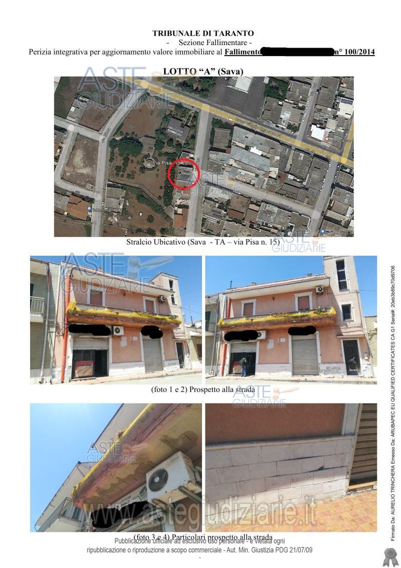 Vendita all'asta Senza incanto, con gara telematica asincrona - LOTTO 1: Locale commerciale composto da piano terra e primo piano, con due serrande e portoncino di accesso. Prezzo base € 120.000,00 (offerta minima € 90.000,00). Data inizio operazioni di vendita: 29/04/2026 ore 16:00. Curatore Dott. Anna Maria Altavilla - Email "altavilla.anna838@gmail.com"; Tel. 0997302593. Rif. Tribunale di Taranto - Fallimentare (nuovo rito) n. 100/2014