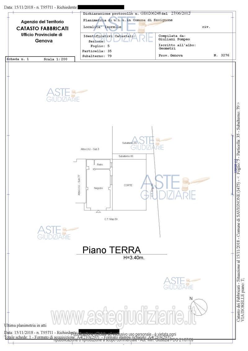 Vendita all'asta Senza incanto, con gara telematica sincrona mista - LOTTO 4: Comune di Savignone (GE), quota di proprietà pari al 100% di locale commerciale sito in Via Isorelle 34, composto dal locale principale, un disimpegno, un servizio igienico, con annessi posto auto e terrazzo, per una superficie commerciale lorda di 56,80 mq. Prezzo base € 13.289,06 (offerta minima € 9.966,79). Data vendita 02/04/2026 ore 12:00. Curatore Dott. Giorgio Dufour - Email "studio@giorgiodufour.com"; Cell. 3356925455. Rif. Tribunale di Genova - Fallimentare (nuovo rito) n. 33/2017