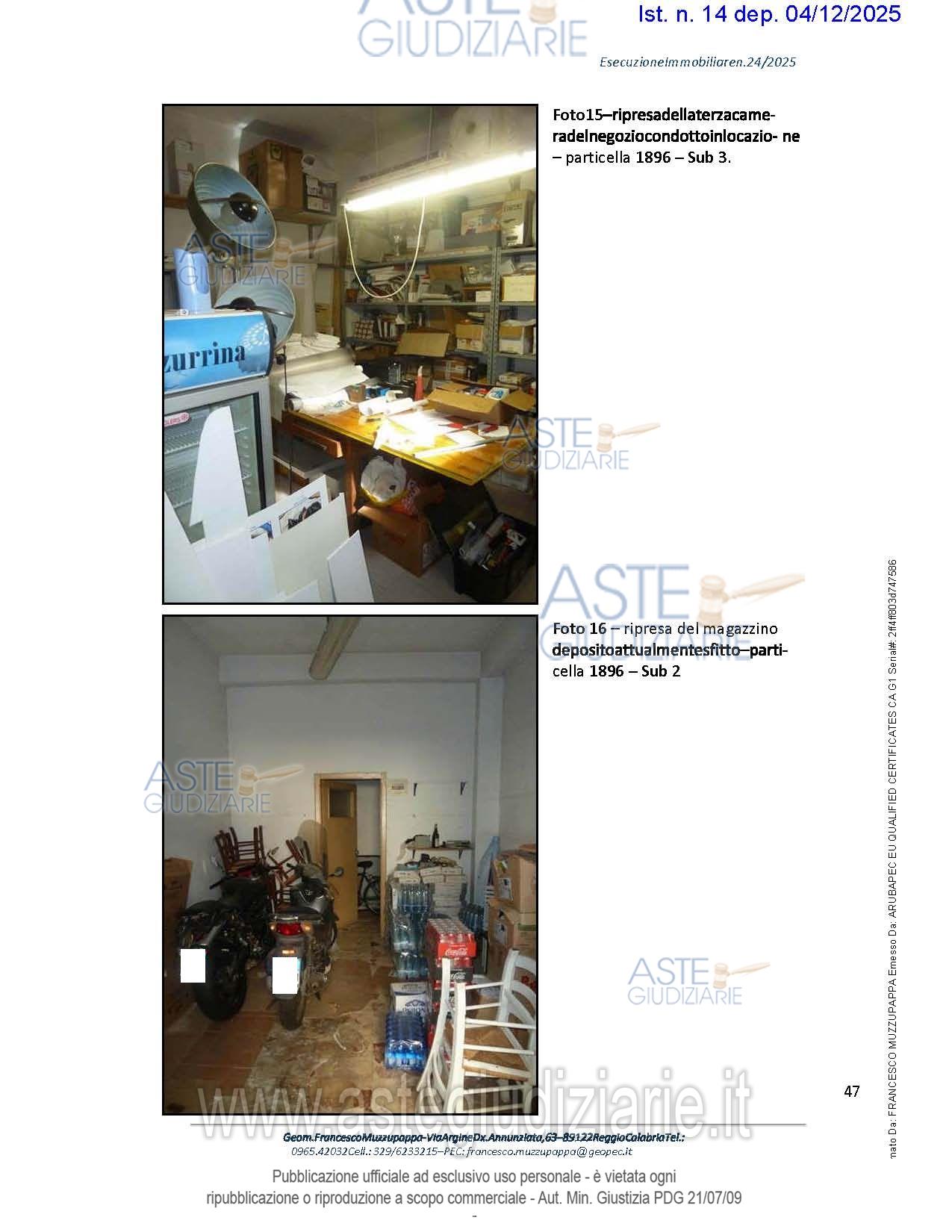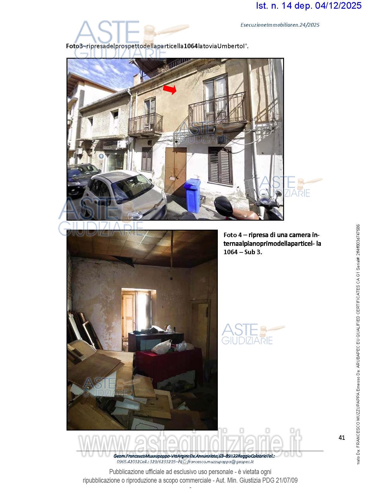 Vendita all'asta Senza incanto, con gara telematica asincrona - LOTTO 3: Negozio sito nel Comune di Scilla (RC) in fregio alla via Umberto I n.ro 5, Categoria C/1, Classe 5, consistenza 42 mq., RenditaCatastale € 1.017,32. Prezzo base € 83.830,00 (offerta minima € 62.872,50). Data inizio operazioni di vendita: 12/05/2026 ore 11:00. Giudice Dott. Stefano Cantone. Professionista delegato alla vendita Dott. Andrea Campiglia - Email "info@studiocampiglia.com"; Tel. 0965810332. Custode Giudiziario Dott. Andrea Campiglia - Email "info@studiocampiglia.com"; Tel. 0965810332. Rif. Tribunale di Reggio di Calabria - Espropriazione immobiliare (cartabia) n. 24/2025