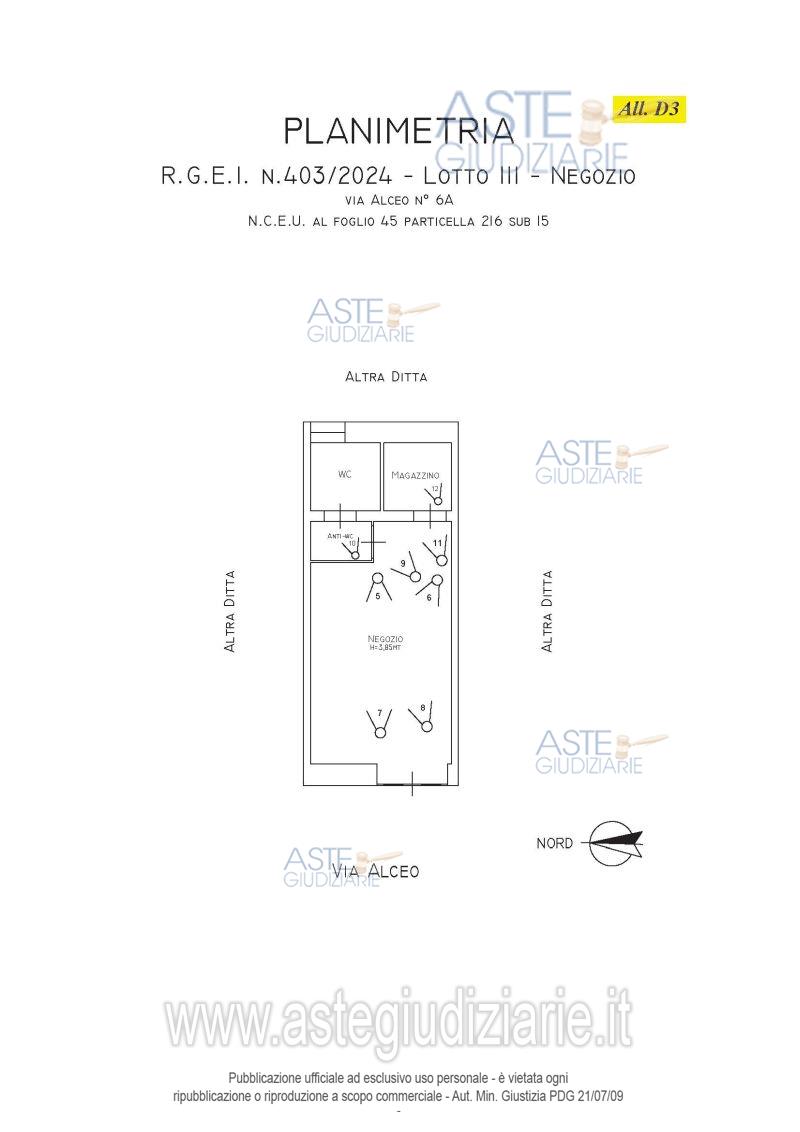 Vendita all'asta Senza incanto, con gara telematica sincrona mista - LOTTO 3: Piena proprietà dell’unità immobiliare commerciale (negozio) sito a Siracusa (SR), Via Alceo n. 6/A censito al N.C.E.U. del Comune di Siracusa al foglio 45, particella 216, sub 15, categoria C/1, classe 7, consistenza mq. 35, rendita € 1.106,25. Prezzo base € 30.000,00 (offerta minima € 22.500,00). Data vendita 21/01/2026 ore 09:00. Giudice Concita Cultrera. Professionista delegato alla vendita Dott. Alessandro Abbruzzo - Email "alessandro.abbruzzo@gmail.com"; Tel. 0931464088. Custode Giudiziario Dott. Alessandro Abbruzzo - Email "alessandro.abbruzzo@gmail.com"; Tel. 0931464088. Rif. Tribunale di Siracusa - Esecuzione immobiliare post legge 80 n. 403/2024