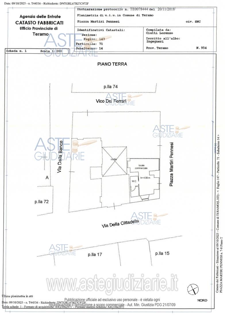 Vendita all'asta Senza incanto, con gara telematica asincrona - LOTTO 02: LOTTO 2 - Diritti pari all’ intero della piena proprietà su “Locale commerciale” sito nel Comune di Teramo, angolo Via della Cittadella/Piazza Martiri Pennesi identificato nel N.C.E.U. nel Comune di Teramo al Fog. 147 – Part. 71 Sub. 14– Z.c.1– Cat. C/1– Cl. 12 – Cons. 33 m²– Sup. Cat. 45 m²– R.C. €. 1.298,68.L’immobile è posto al piano terra, della superficie catastale di Mq. 45,00 circa, costituito da un vano e servizi. Prezzo base € 44.000,00 (offerta minima € 33.000,00). Data inizio operazioni di vendita: 25/03/2026 ore 15:00. Professionista delegato alla vendita Avv. Odette Frattarelli - Email "odette.frattarelli@libero.it"; Tel. 086189478. Custode Giudiziario Dott. Eda Silvestrini - Email "eda.silvestrini@gmail.com"; Cell. 3290512413; Tel. 3290512413. Rif. Tribunale di Teramo - Esecuzione immobiliare post legge 80 n. 148/2025