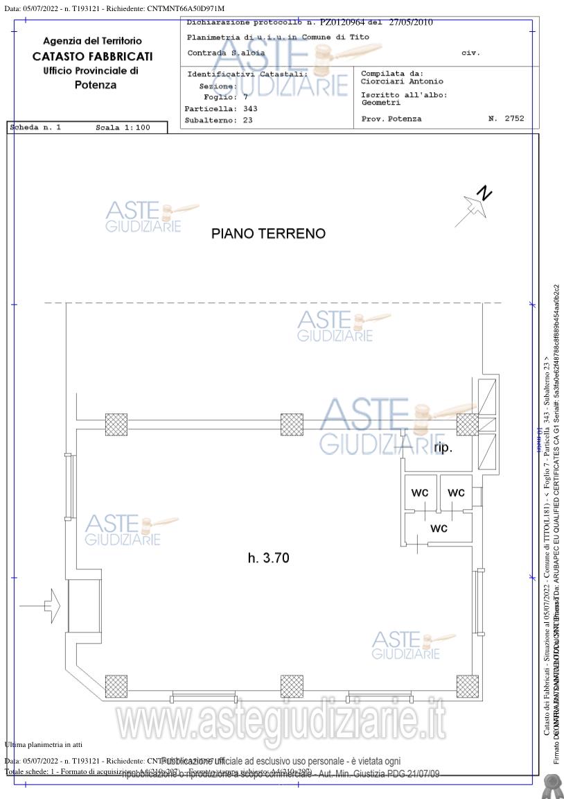 Vendita all'asta Senza incanto - LOTTO 2: diritti pari all’intero (1/1) in piena proprietà di un locale commerciale sito nel Comune di Tito (PZ) alla C.da Santa Loja, piano terra, costituito da un locale adibito alla vendita, un bagno con relativo antibagno. Prezzo base € 31.331,25 (offerta minima € 23.498,43). Data vendita 09/07/2026 ore 10:00. Professionista delegato alla vendita: Avv. Francesco Missanelli - Email "francescomissanelli@gmail.com"; Tel. 0971/443116.