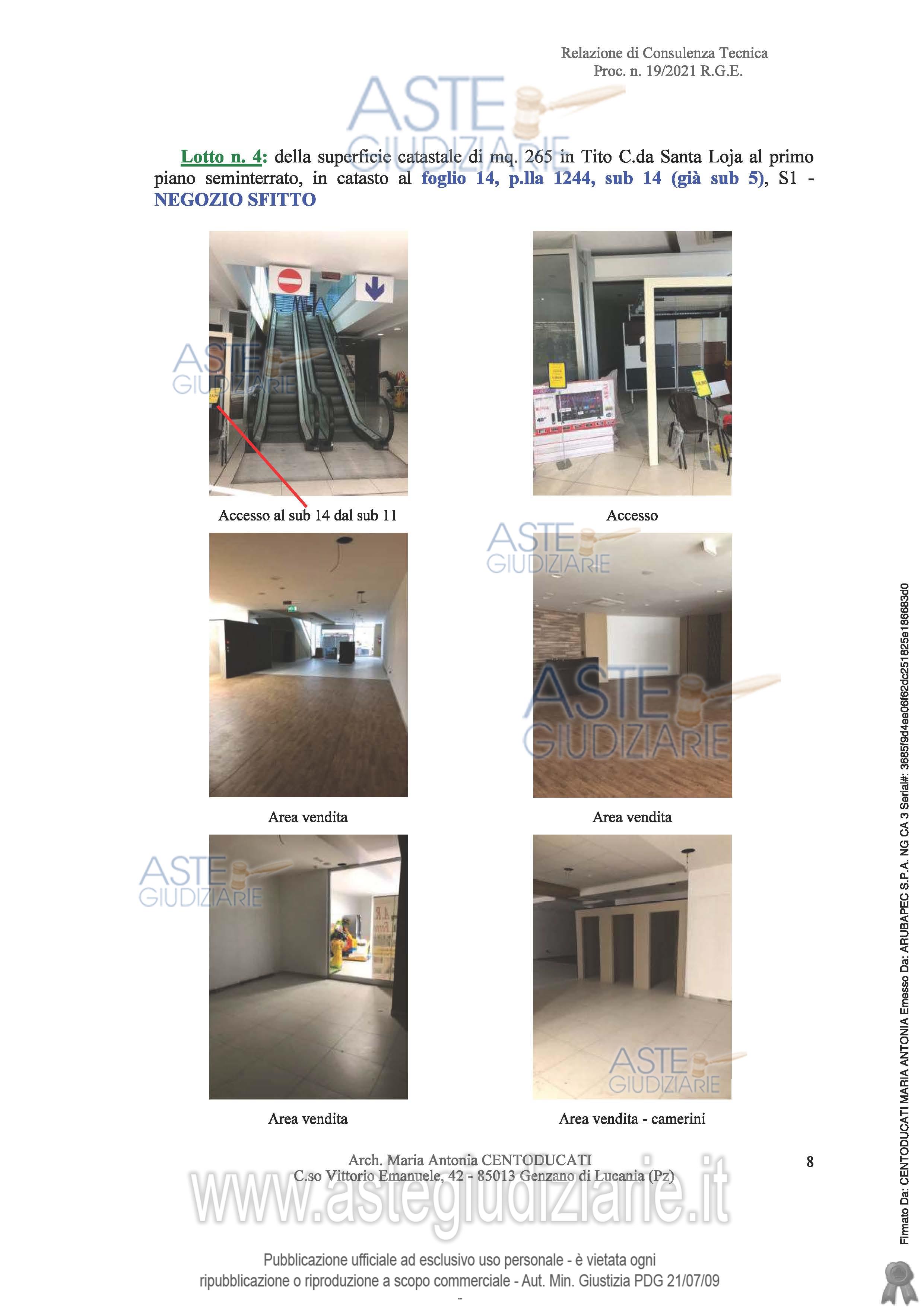 Vendita in attesa dell'emissione del nuovo bando d'asta. LOTTO 4: piena ed intera proprietà (1/1) di un locale commerciale di circa 250 mq., situato al piano seminterrato di un fabbricato adibito ad attività commerciale situato alla c.da Santa Loja del comune di TITO (PZ); . Ultimo prezzo base € 198.000,00 (offerta minima € 148.500,00). Professionista delegato alla vendita Avv. Francesco Missanelli - Email "francescomissanelli@gmail.com"; Tel. 0971443116. Curatore Avv. Monica Dea De Luca - Email "avv.monicadeadeluca@gmail.com"; Tel. 0971287426. Custode Giudiziario Avv. Monica Dea De Luca - Email "avv.monicadeadeluca@gmail.com"; Tel. 0971287426. Rif. Tribunale di Potenza - Esecuzione immobiliare post legge 80 n. 19/2021