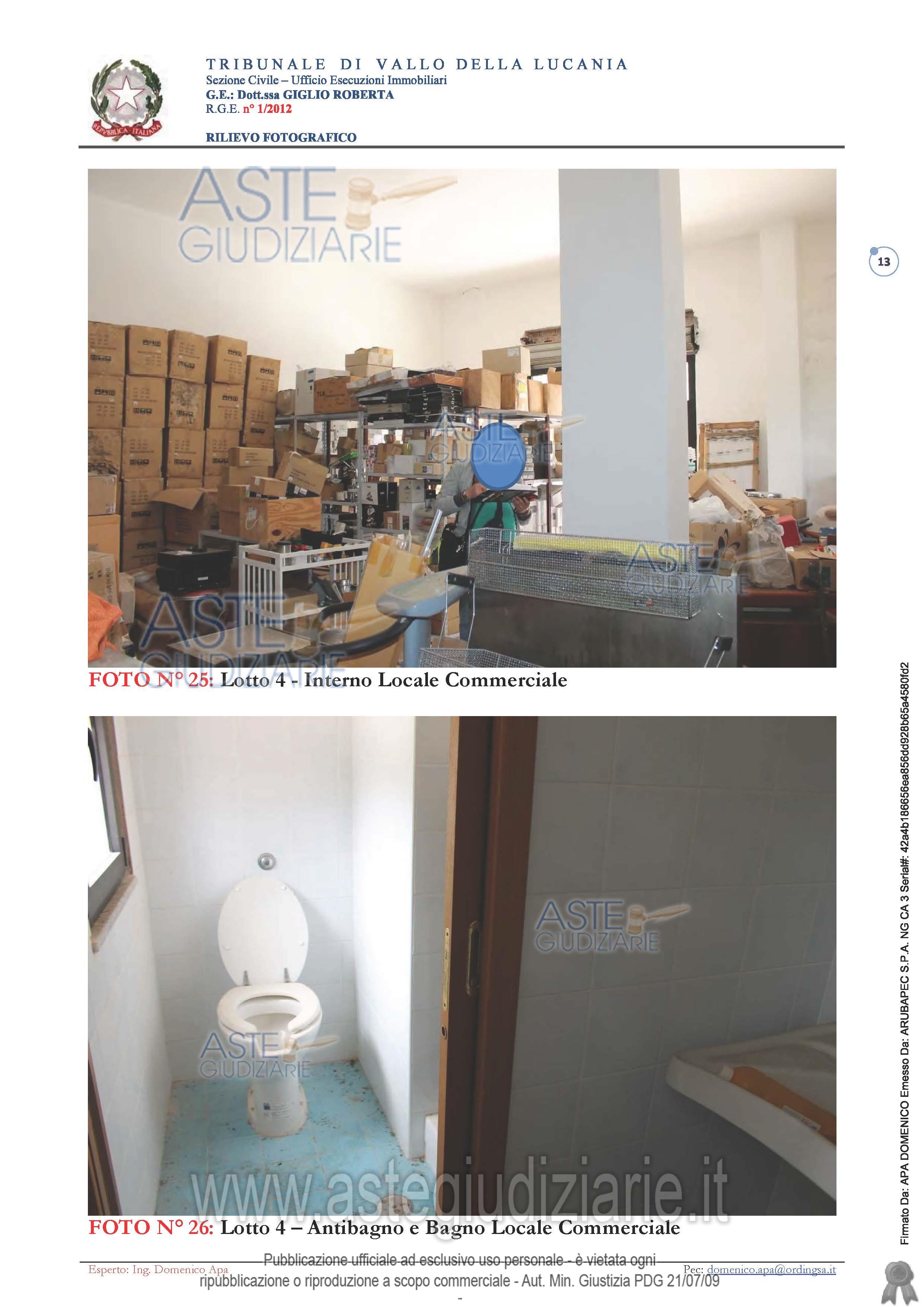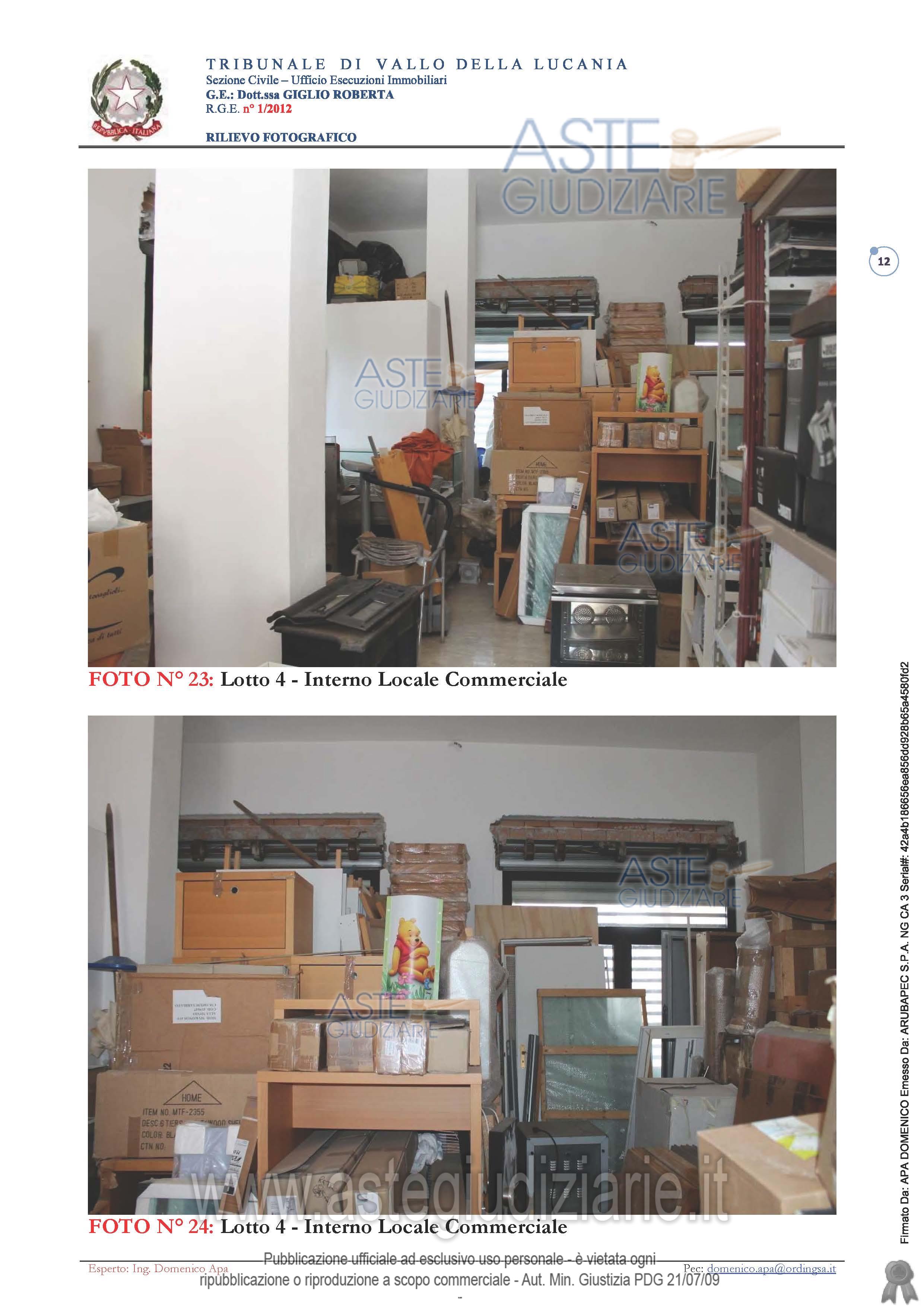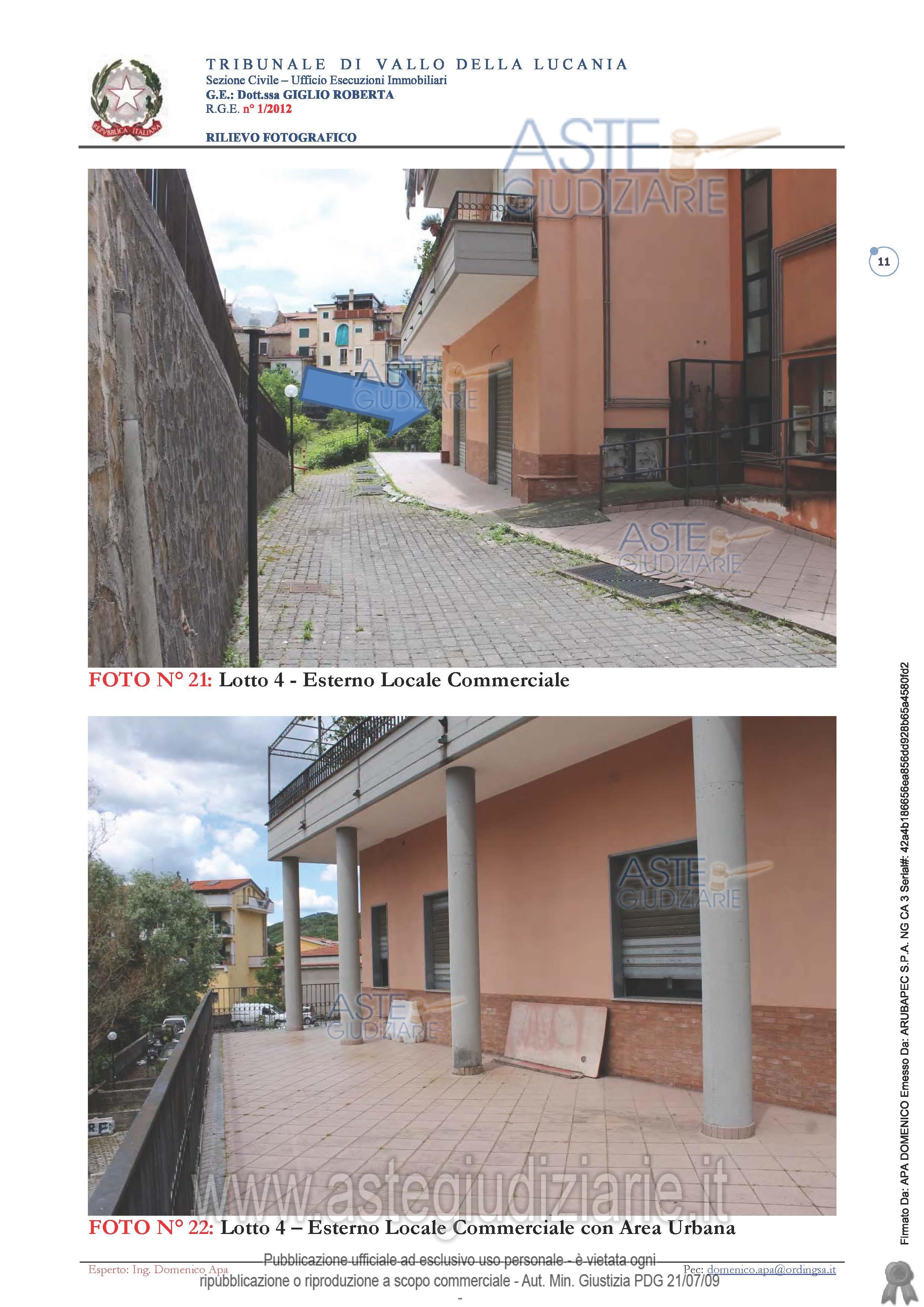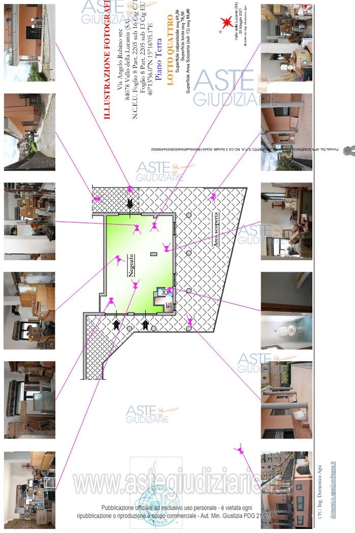 Vendita all'asta Senza incanto, con gara telematica asincrona - LOTTO 4: Negozio + Area Urbana. Prezzo base € 116.000,00 (offerta minima € 87.000,00). Data inizio operazioni di vendita: 25/03/2026 ore 11:00. Giudice Roberta Giglio. Professionista delegato alla vendita Dott. Pietro Di Lorenzo. Custode Giudiziario Dott. Pietro Di Lorenzo - Email "pietro-dilorenzo@outlook.it". Rif. Tribunale di Vallo della Lucania - Esecuzione immobiliare post legge 80 n. 1/2012