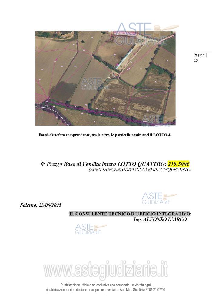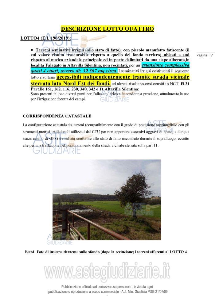 Vendita all'asta Senza incanto, con gara telematica asincrona - LOTTO 4: Terreni seminativi irrigui (allo stato di fatto), con piccolo manufatto fatiscente (il cui valorerisulta trascurabile rispetto a quello del fondo terriero) ubicati a sud rispetto al nucleo aziendale principale e in parte delimitati da una siepe alberata, per un’estensione complessiva di: 39.367 mq circa in Contrada Falagato. Prezzo base € 219.500,00 (offerta minima € 164.625,00). Data inizio operazioni di vendita: 09/06/2026 ore 16:00. Professionista delegato alla vendita Avv. Francesco Marino. Custode Giudiziario Avv. Francesco Marino - Email "avvfrancescomarinoa@gmail.com". Rif. Tribunale di Salerno - Esecuzione immobiliare post legge 80 n. 190/2019