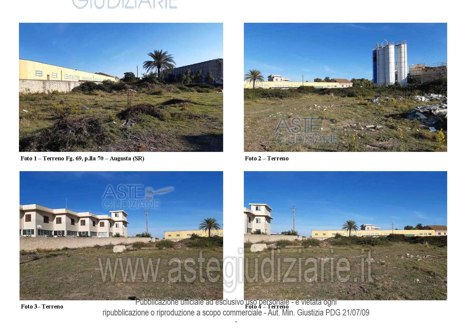 Vendita all'asta Senza incanto, con gara telematica sincrona mista - LOTTO 6: Piena proprietà del terreno sito in Augusta, contrada Monte Pisone, in prossimità della SS193, esteso 2.107 mq., ricadente tra le aree individuate e vincolate dal Piano di Sviluppo Industriale (Piano A.S.I.), confinante con le p.lle 68, 251 e 37 del foglio 69 del Catasto Terreni di Augusta. Riportato nel Catasto Terreni di Augusta al foglio 69, particella 70, semin. Arbor. di 2^, are 21.07, R.D. € 16,87, R.A. € 3,26. Prezzo base € 14.997,66 (offerta minima € 11.248,25). Data vendita 18/02/2026 ore 12:00. Giudice Concita Cultrera. Professionista delegato alla vendita Avv. Valentina Bonfiglio - Email "valentinabonfiglio1976@gmail.com"; Tel. 3394247555. Custode Giudiziario Avv. Valentina Bonfiglio - Email "valentinabonfiglio1976@gmail.com"; Tel. 3394247555. Rif. Tribunale di Siracusa - Esecuzione immobiliare post legge 80 n. 257/2001