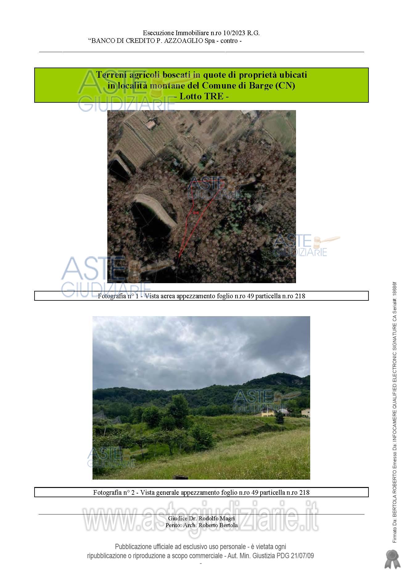 Vendita all'asta Senza incanto, con gara telematica sincrona mista - LOTTO 3: Piena proprietà di terreni agricoli in zona montana nel Comune di Barge. Prezzo base € 2.505,00 (offerta minima € 1.879,00). Data vendita 26/05/2026 ore 15:30. Giudice Dott. Roberta Bonaudi. Professionista delegato alla vendita Avv. Giulia Negri. Custode Giudiziario Ivg Srl - Ifir Piemonte - Email "richiestevisite.cuneo@ivgpiemonte.it"; Tel. 01711873923. Rif. Tribunale di Cuneo - Contenzioso civile n. 357/2024