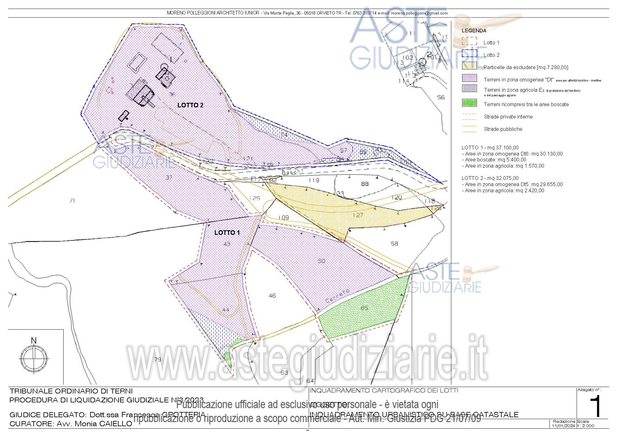Vendita all'asta Senza incanto, con gara telematica asincrona - LOTTO 1: A) Full ownership of lands, with a total area of 3.71.00 hectares (mostly buildable with tourist-receptive destination, as stated in the appraisal report) located in the Municipality of Baschi, Loc. Mortaro with access, in part, from the right side of Strada Prov. del Mignattaro no. 93, near its junction with Strada Stat. Baschi Todi no. 448, at Km 3+300 of the latter, and, for the remaining part, from a remnant of the road of Cerreto, which originates from the aforementioned provincial road, identified at the Revenue Agency Provincial Office of Terni, Land Registry of the Municipality of Baschi at Sheet 44 parcel 37 and Sheet 45 parcels 43, 44, 50 and 65; B) Full ownership of lands, enclosed, located in the Municipality of Baschi, between Loc. Mortano and Loc. Pian degli Schiavi, with a total area of 70 sqm, identified at the Revenue Agency Provincial Office of Terni, Land Registry of the Municipality of Baschi at Sheet 44 parcels 92 and 123. All the lands in the lot are within the delimitation perimeter of the Tiber River Park, included in the sites of community interest and in the areas of special protection and subject to landscape constraint according to art. 142, paragraph 1, letter b) of Legislative Decree 22.01.2004 no. 42. Parcel 65 is further subject to hydrogeological constraint according to R.D. 30.12.1923 no. 3267. Reference is made to the sales notice for the sales conditions, as well as to the appraisal report of the Expert for an accurate and precise description of the assets, also concerning the urban destination, and for the determination of the estimated price. . Prezzo base € 205.800,00 (offerta minima € 154.350,00). Data inizio operazioni di vendita: 09/04/2026 ore 10:00. Giudice Dott. Francesca Grotteria. Curatore Avv. Monia Caiello - Tel. 0763 342500. Rif. Tribunale di Terni - Liquidazione giudiziale(cci) n. 3/2023