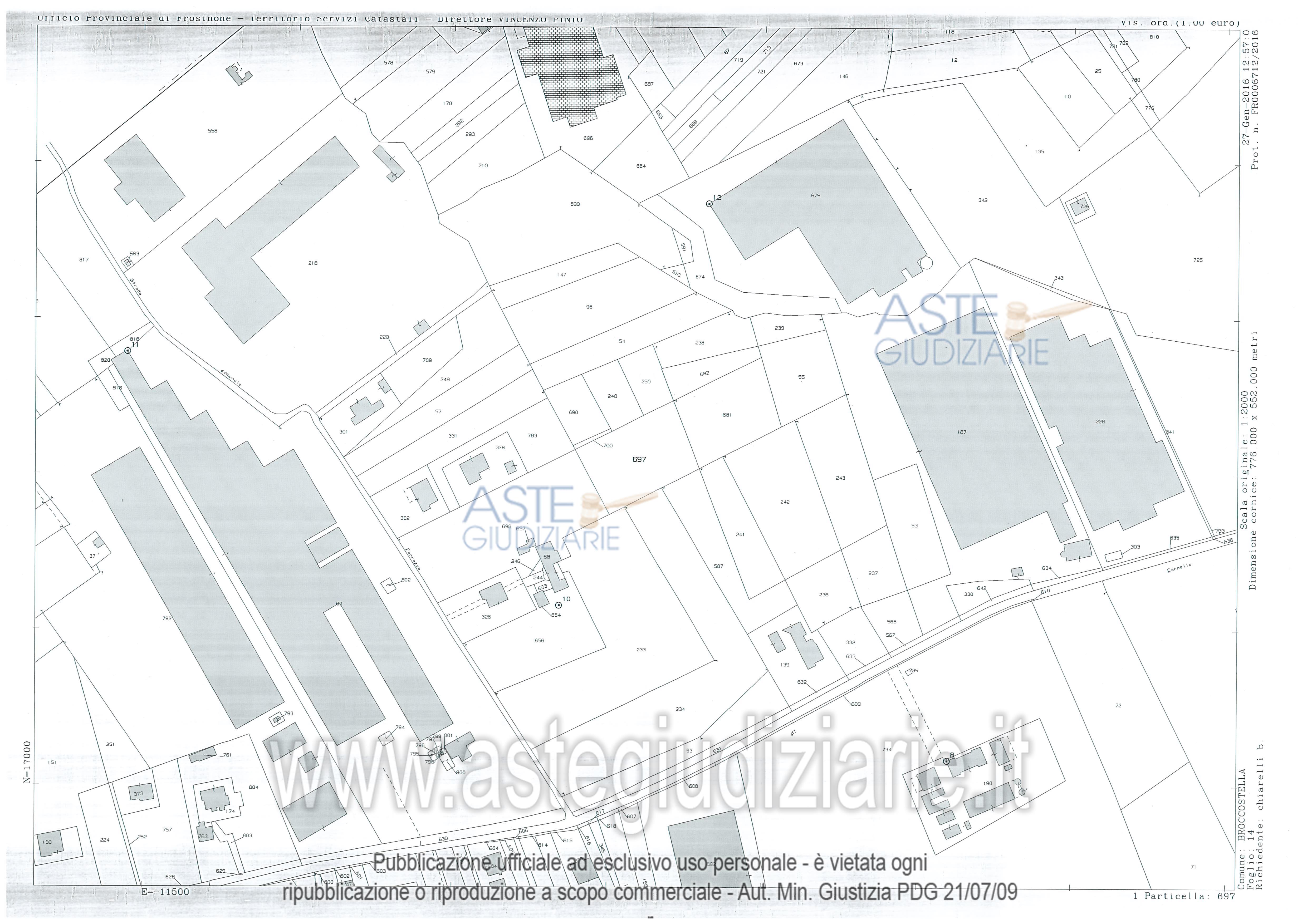 Vendita all'asta Senza incanto, con gara telematica asincrona - LOTTO 9: Aree di zona agricola “E/1 zona agricola estensiva” per le quali si applicano le disposizioni di cui al tit. IV della L.R. 38/1999, così come modificata dalla L.R. n. 8/2003.I terreni, situati nel Comune di Broccostella (FR) in via Ferrazza in adiacenza al compendio industriale, si estendono per una superficie complessiva di oltre 36.673 mq e sono attualmente utilizzati per la maggior parte come area di transito e di parcheggio di automezzi aziendali. Prezzo base € 800.195,50 (offerta minima € 800.195,50). Data inizio operazioni di vendita: 24/03/2026 ore 11:00. Giudice Dott. Simona Di Nicola. Rif. Tribunale di Frosinone - Nuovo concordato preventivo n. 19/2012
