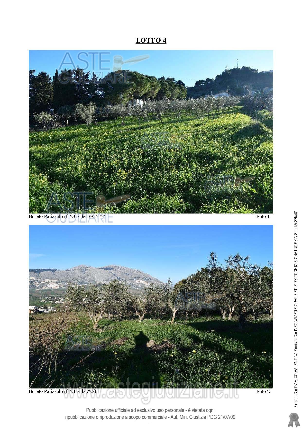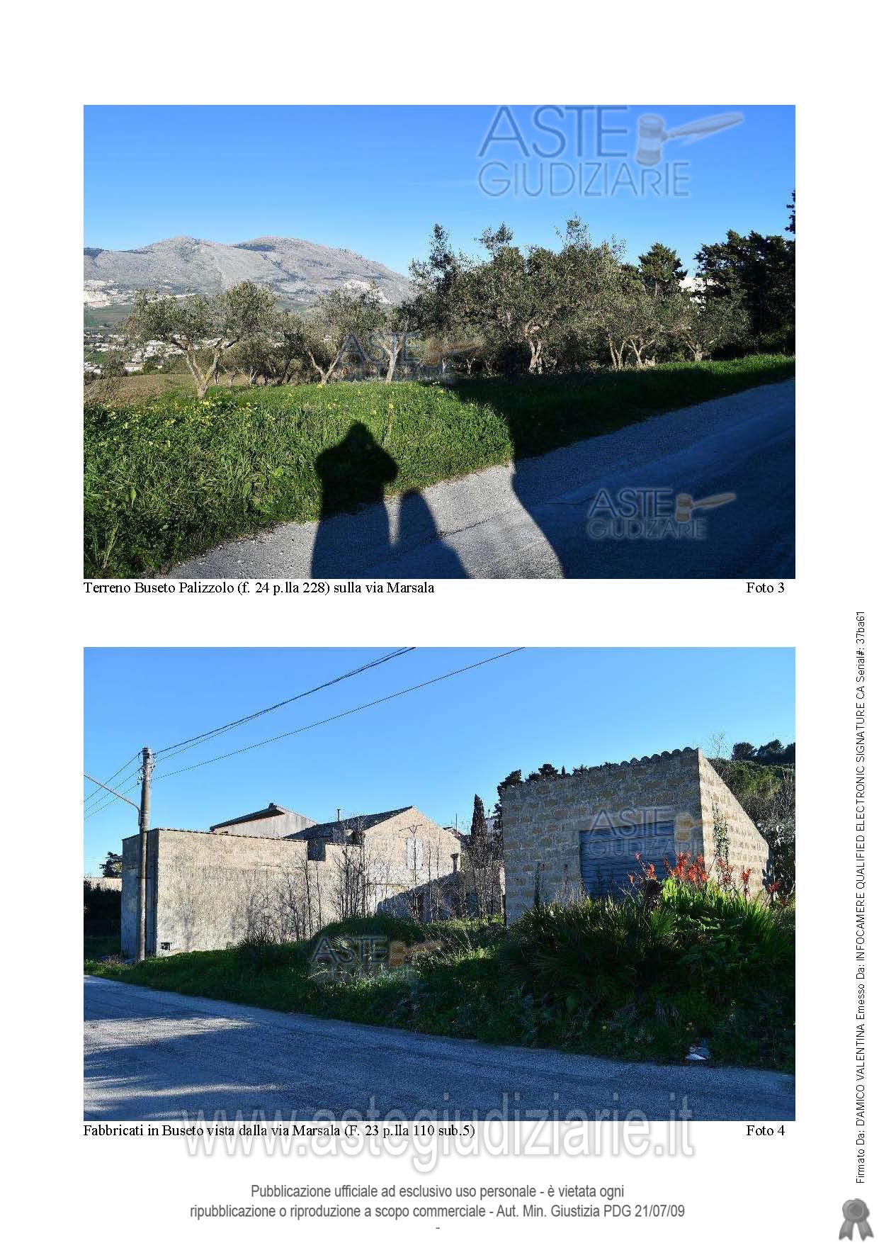 Vendita all'asta Senza incanto, con gara telematica asincrona - LOTTO 4: Piena proprietà per l'intero di un appezzamento di terreno sito nel Comune di Buseto Palizzolo (Trapani) c/da Buseto Soprano della superficie catastale complessiva di mq.3420 e piena proprietà per l'intero di un fabbricato adibito a civile abitazione sito pure nel Comune di Buseto Palizzolo (Trapani) c/da Buseto Soprano via Marsala. Prezzo base € 46.000,00 (offerta minima € 34.500,00). Data inizio operazioni di vendita: 26/05/2026 ore 11:00. Professionista delegato alla vendita Avv. Dario Guarnotta - Email "darioguarnotta@libero.it"; Cell. 3395948503; Tel. 0923871443. Custode Giudiziario Avv. Dario Guarnotta - Email "darioguarnotta@libero.it"; Cell. 3395948503; Tel. 0923871443. Rif. Tribunale di Trapani - Esecuzione immobiliare post legge 80 n. 90/2021