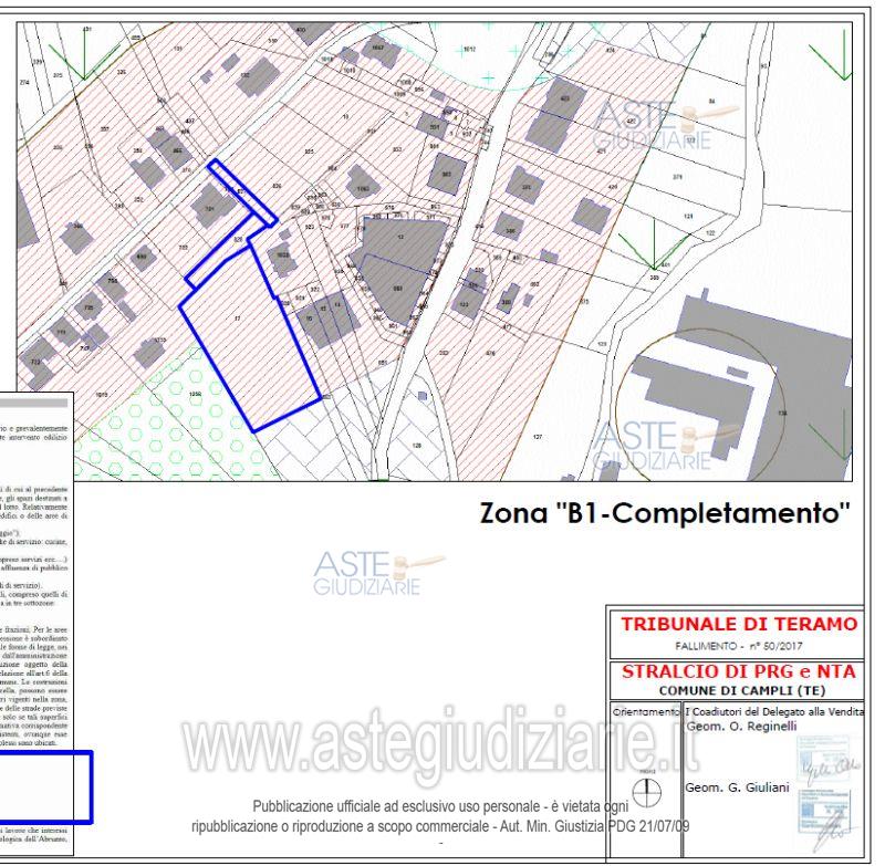 Vendita all'asta Senza incanto, con gara telematica asincrona - LOTTO 1: Terreno servito da una porzione di viabilità secondaria. Il lotto presenta una giacitura leggermente acclive verso sud dove è presente un canale d’acqua iscritto tra quelli tutelati secondo la legge Galasso, con una fascia di rispetto di 25 mt. I terreni ricadono secondo le previsione del P.R.G. in gran parte in Zona edificabile “B1” completamento (circa mq. 3.535) ed in minima parte in parcheggio, piazze e strade (circa mq. 1.400). Prezzo base € 21.135,00 (offerta minima € 15.851,00). Data inizio operazioni di vendita: 19/11/2025 ore 09:00. Giudice Ninetta D’Ignazio. Professionista delegato alla vendita Avv. Carlo Del Torto. Custode Giudiziario Avv. Carlo Del Torto - Email "venditedelegatedigennaro@gmail.com". Rif. Tribunale di Teramo - Fallimentare (nuovo rito) n. 50/2017