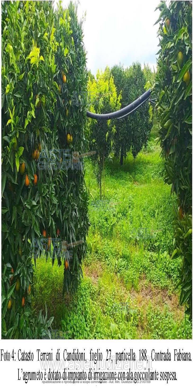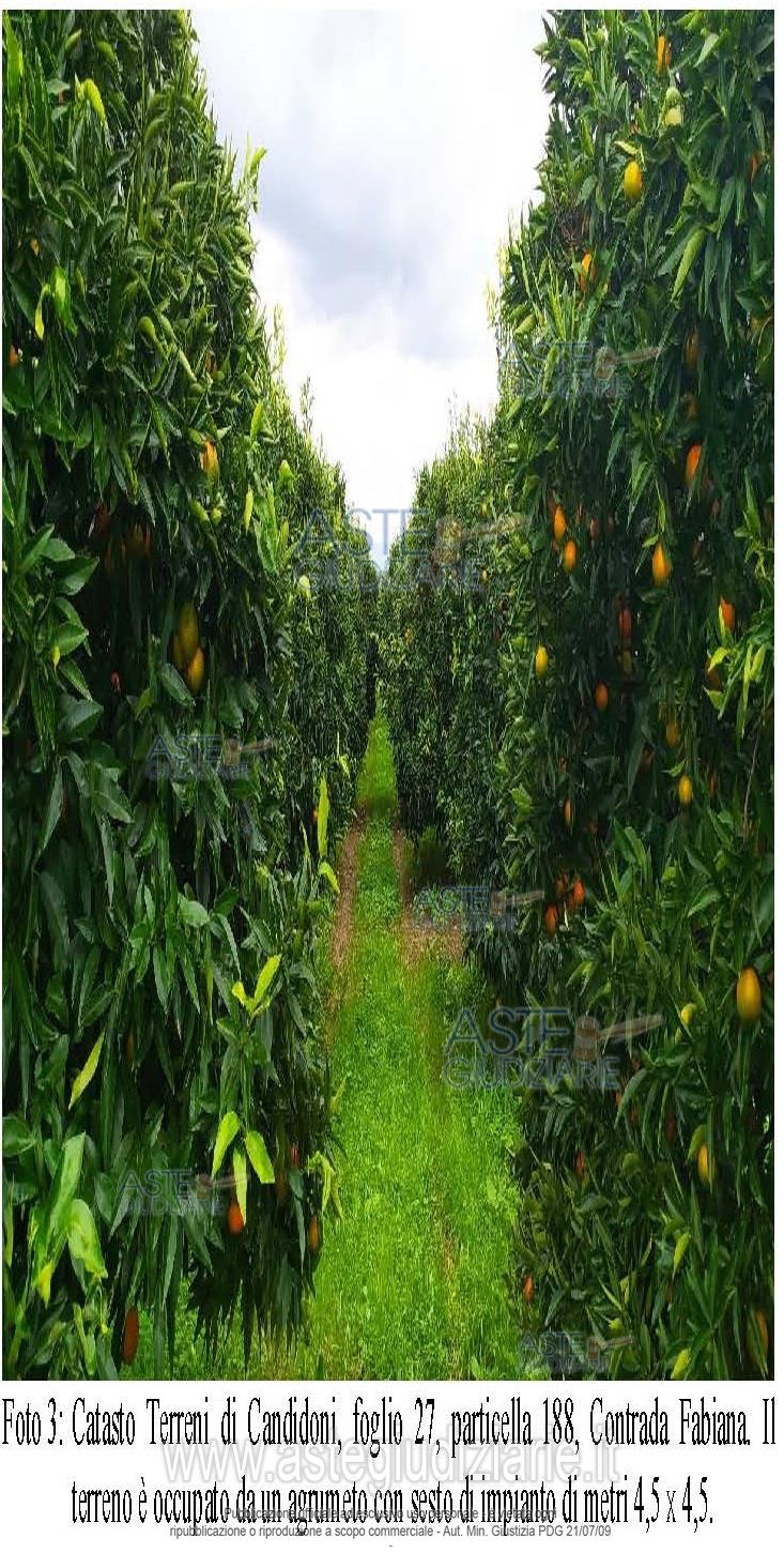 Vendita all'asta Senza incanto, con gara telematica asincrona - LOTTO 5: piena proprietà di fondo rustico coltivato ad agrumi, della superficie catastale di ettari 0.38.75; si presenta con giacitura pianeggiante, in buone condizioni di vegetazione ed è dotato di impianto di irrigazione ad ala gocciolante sospesa. Prezzo base € 9.285,12 (offerta minima € 6.963,84). Data inizio operazioni di vendita: 22/05/2026 ore 11:00. Giudice Dott. Marta Caineri. Professionista delegato alla vendita Dott. Roberto Franchetti - Email "robertofranchetti@hotmail.com"; Tel. 0966645074. Custode Giudiziario Dott. Roberto Franchetti - Email "robertofranchetti@hotmail.com"; Tel. 0966645074. Rif. Tribunale di Palmi - Esecuzione immobiliare post legge 80 n. 35/2000