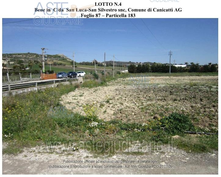 Vendita all'asta Senza incanto, con gara telematica sincrona mista - LOTTO 4: Piena proprietà per la quota di 1000/1000 terreno agricolo ubicato in c.da San Luca – San Silvestro con accesso dalla strada provinciale n. 48, il terreno si trova a pochi km da Canicattì .Il terreno ha dimensione regolare, a giacitura pianeggiante, ed esposizione nord- est. Identificazione catastale: foglio 87, particella 183 (catasto terreni),qualità/classe seminativo 2, superficie 12.997 mq. Prezzo base € 12.975,00 (offerta minima € 9.731,25). Data vendita 08/01/2026 ore 16:30. Professionista delegato alla vendita Dott. Domenica Zagrì - Email "domenicazagri@libero.it"; Cell. 3335019005; Tel. 3335019005. Custode Giudiziario Dott. Domenica Zagrì - Email "domenicazagri@libero.it"; Cell. 3335019005; Tel. 3335019005. Rif. Tribunale di Agrigento - Esecuzione immobiliare post legge 80 n. 124/2021