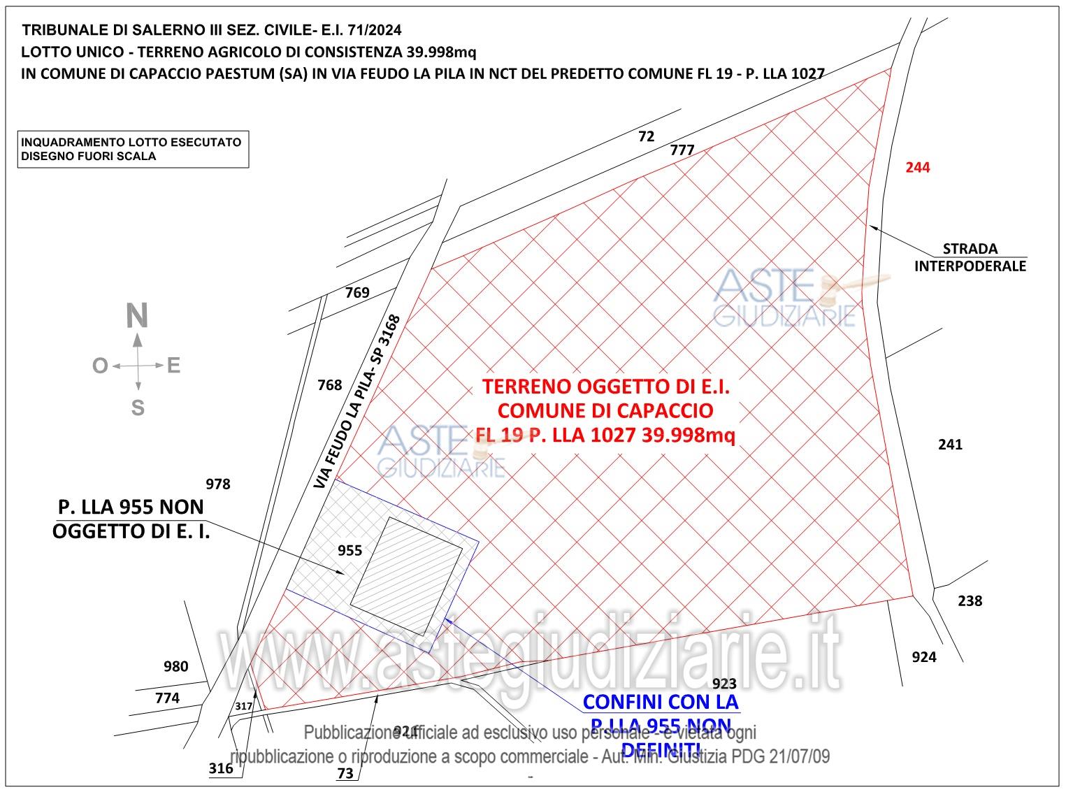 Vendita all'asta Senza incanto, con gara telematica asincrona - LOTTO UNICO: Piena proprietà: TERRENO AGRICOLO DI CONSISTENZA 39.998 mq IN COMUNE DI CAPACCIO PAESTUM (SA) IN VIA FEUDO LA PILA IN NCT DEL PREDETTO COMUNE FL 19 - P. LLA 1027. Prezzo base € 360.000,00 (offerta minima € 270.000,00). Data inizio operazioni di vendita: 22/04/2026 ore 17:00. Giudice Dott. Maria Carolina De Pasquale. Professionista delegato alla vendita Avv. Paolo Glielmi. Custode Giudiziario Avv. Paolo Glielmi - Email "avvpaologlielmi@libero.it"; Cell. 3384403965; Tel. 0828213216. Rif. Tribunale di Salerno - Espropriazione immobiliare (cartabia) n. 71/2024