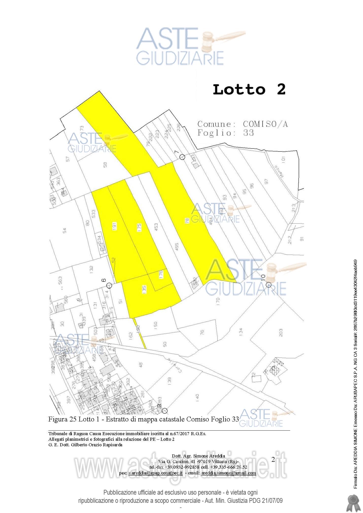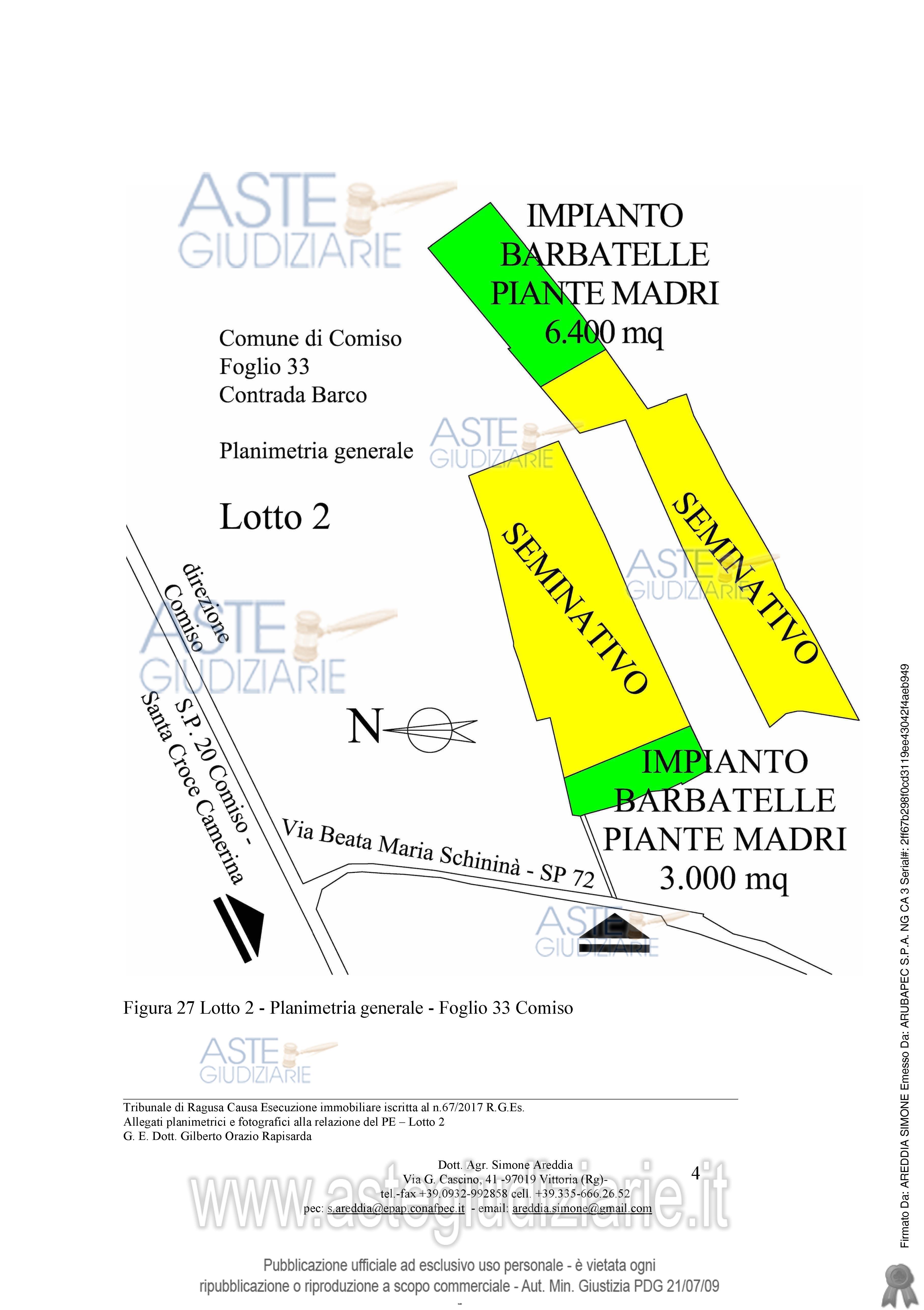 Vendita all'asta Senza incanto, con gara telematica sincrona mista - LOTTO 2: piena proprietà, per la quota di 1/1, di terreno a Comiso Contrada Barco . Prezzo base € 69.187,50 (offerta minima € 51.890,63). Data vendita 29/04/2026 ore 10:00. Giudice Antonio Pianoforte. Professionista delegato alla vendita Dott. Carmen Figurino Gangitano - Email "studiobuscema.modica@gmail.com". Custode Giudiziario Dott. Carmen Figurino Gangitano - Email "studiobuscema.modica@gmail.com". Rif. Tribunale di Ragusa - Esecuzione immobiliare post legge 80 n. 67/2017