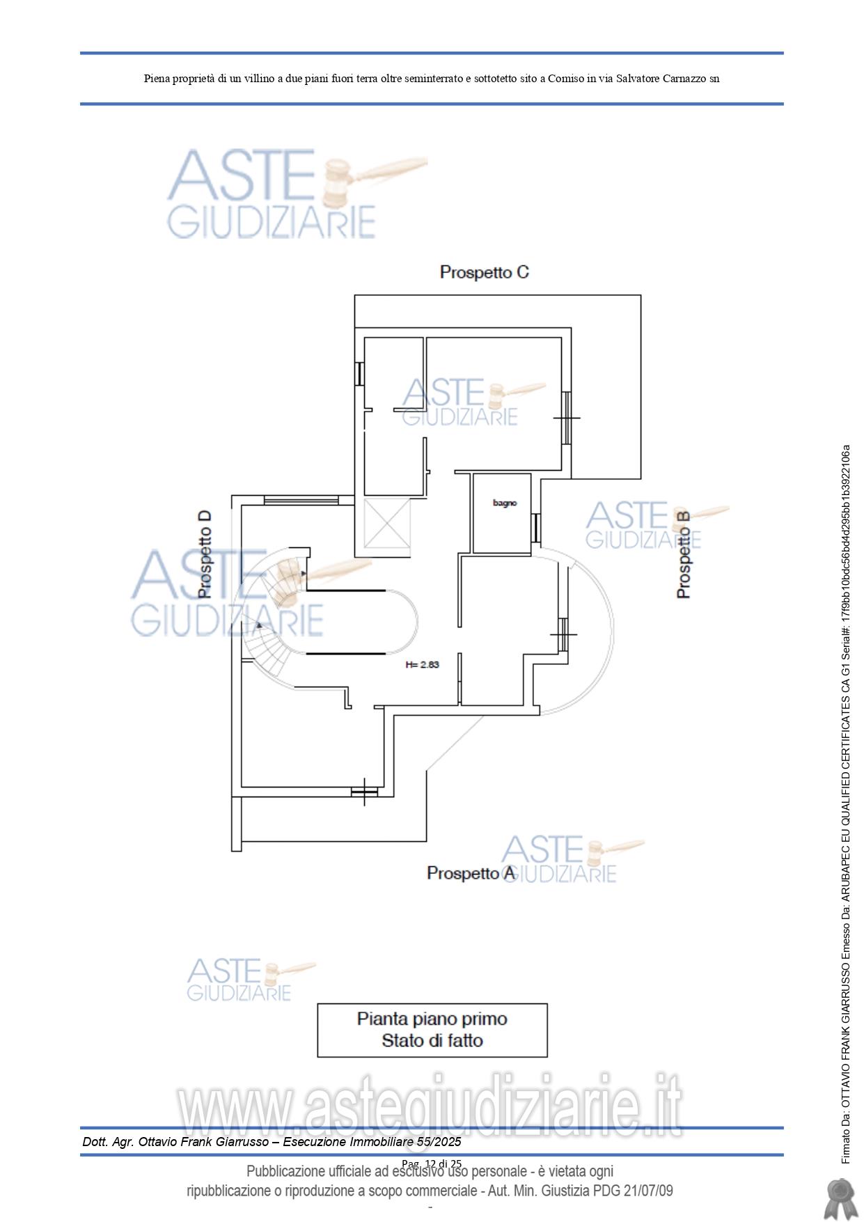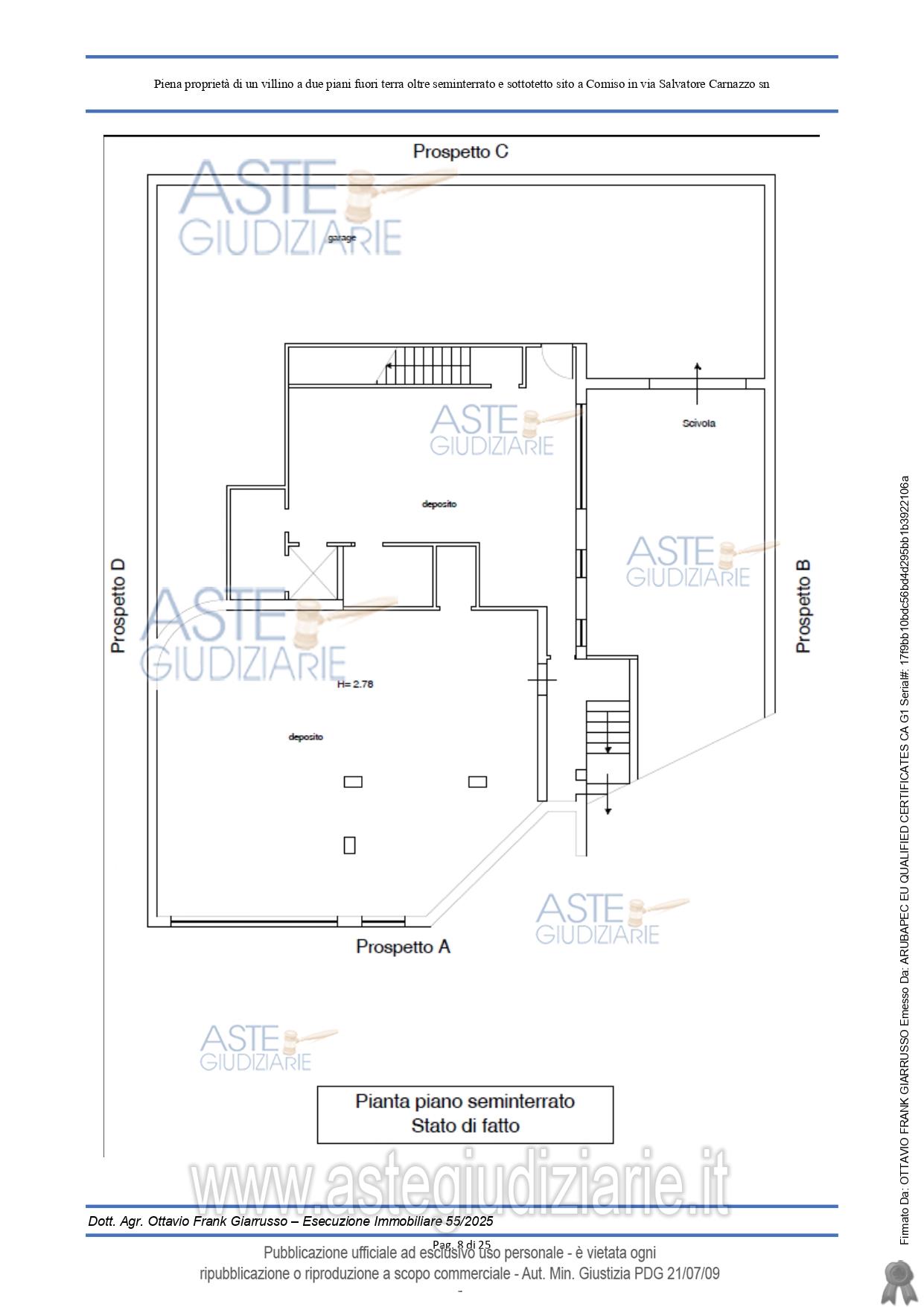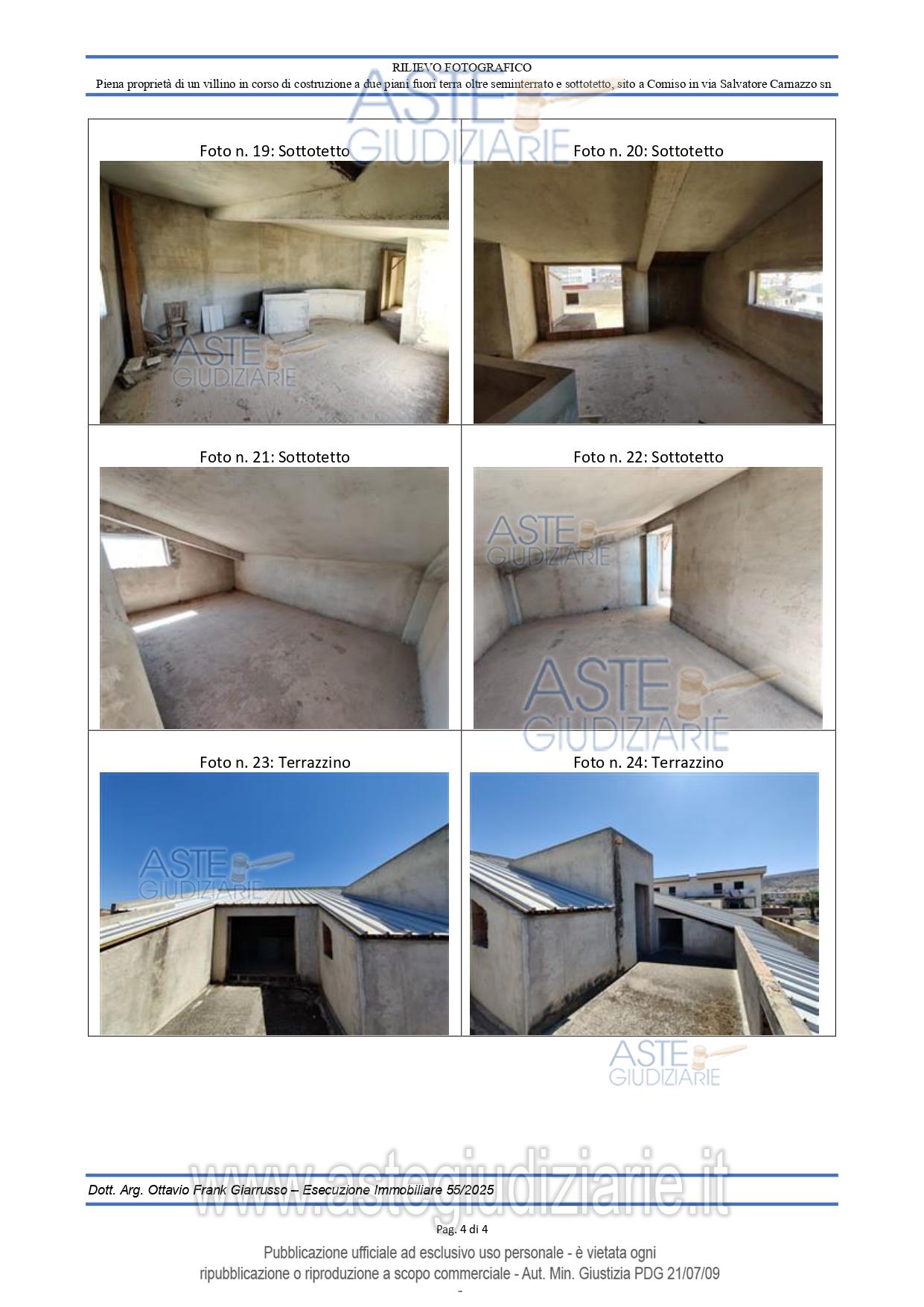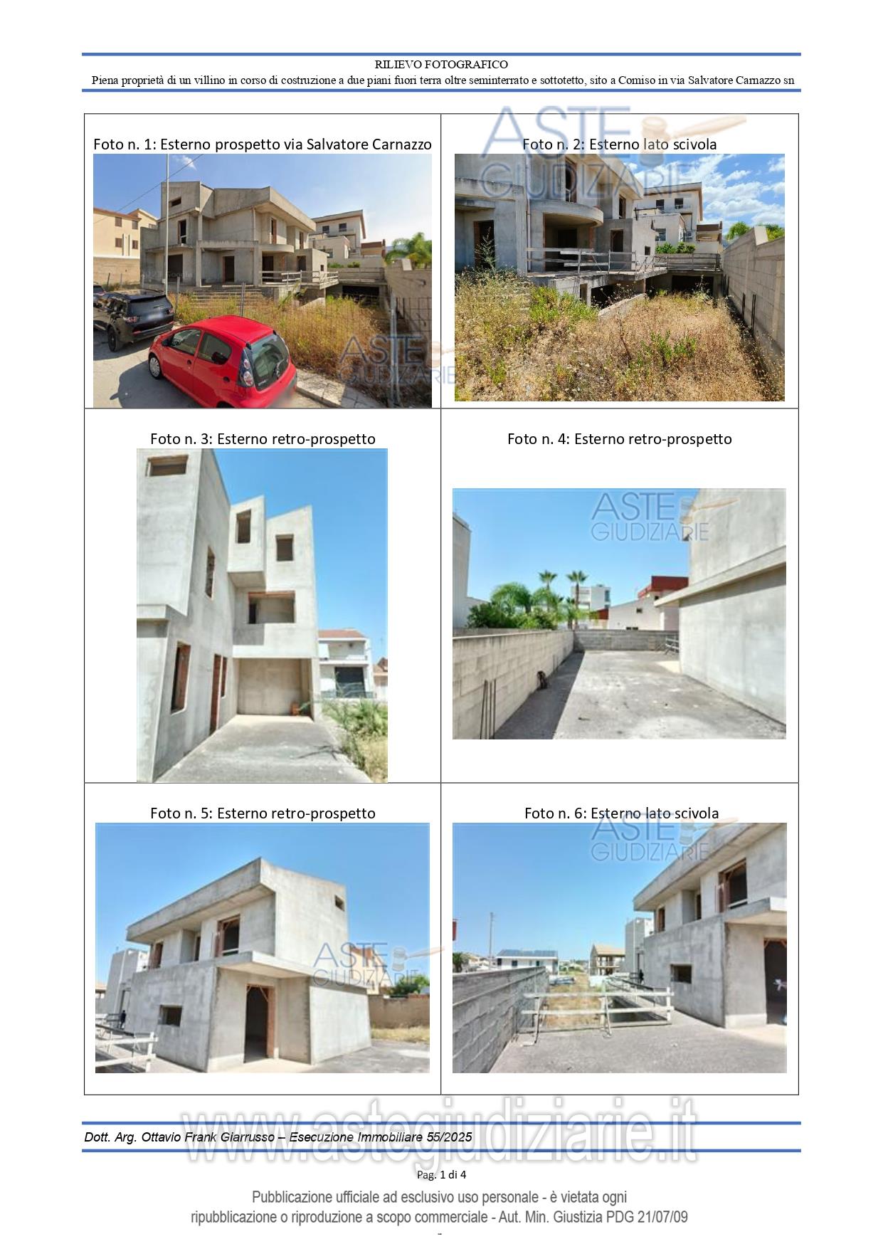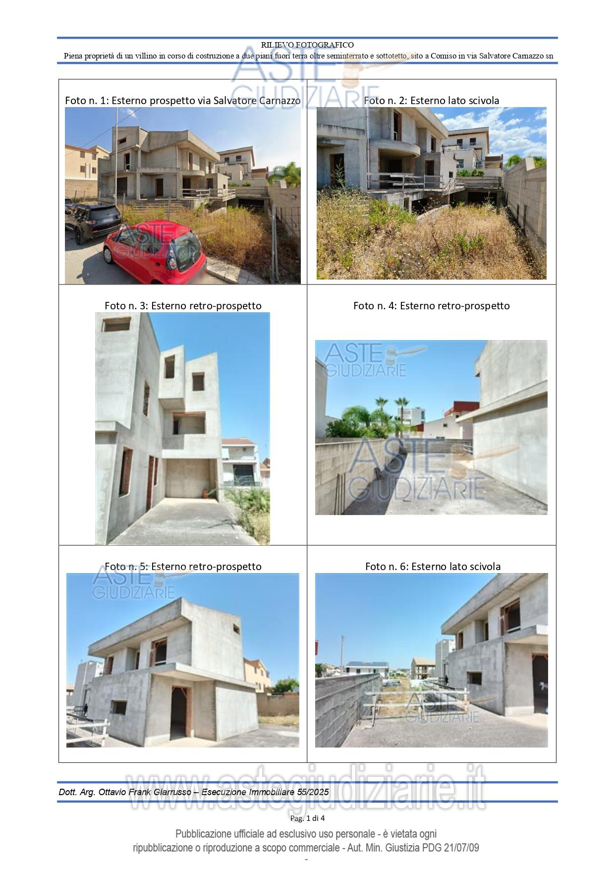Vendita all'asta Senza incanto, con gara telematica sincrona mista - LOTTO UNICO: Piena proprietà di un terreno ubicato a Comiso in via Carnazzo sn, sul quale in realtà insiste il rustico di un fabbricato unifamiliare costituito da un piano seminterrato, un piano terra (rialzato), un primo piano ed un piano sottotetto. Il fabbricato, non censito, insiste su un lotto ubicato nel territorio comunale di Comiso in via Carnazzo sn .L’immobile si presenta in corso di costruzione con lavori interrotti. Prezzo base € 323.000,00 (offerta minima € 242.250,00). Data vendita 03/04/2026 ore 16:30. Professionista delegato alla vendita Avv. Enrico Maria Belgiorno - Email "studiolegalebelgiorno@gmail.com"; Cell. 3388785007; Tel. 0932903430. Custode Giudiziario Avv. Enrico Maria Belgiorno - Email "studiolegalebelgiorno@gmail.com"; Cell. 3388785007; Tel. 0932903430. Rif. Tribunale di Ragusa - Espropriazione immobiliare (cartabia) n. 55/2025