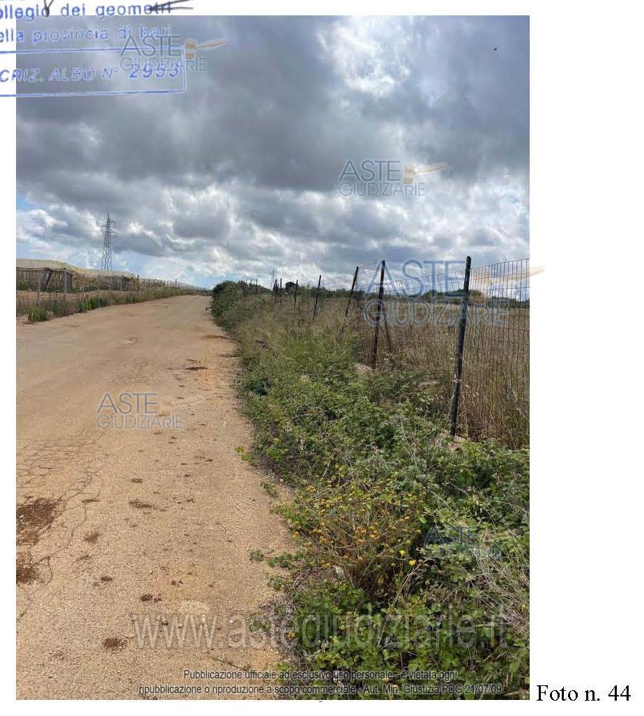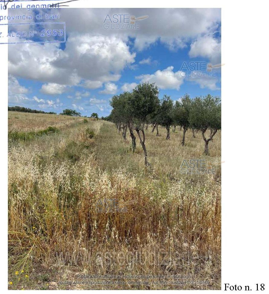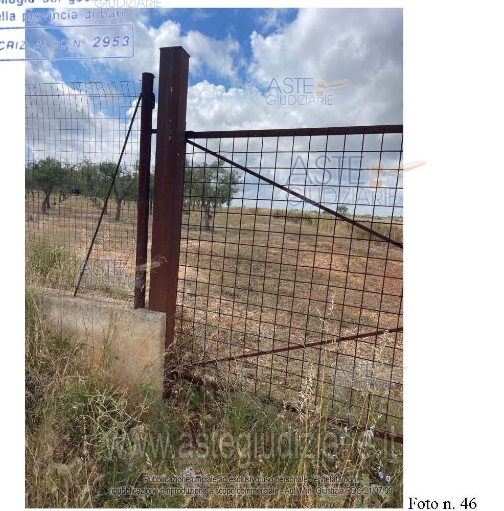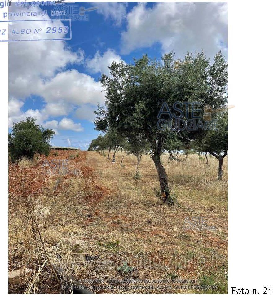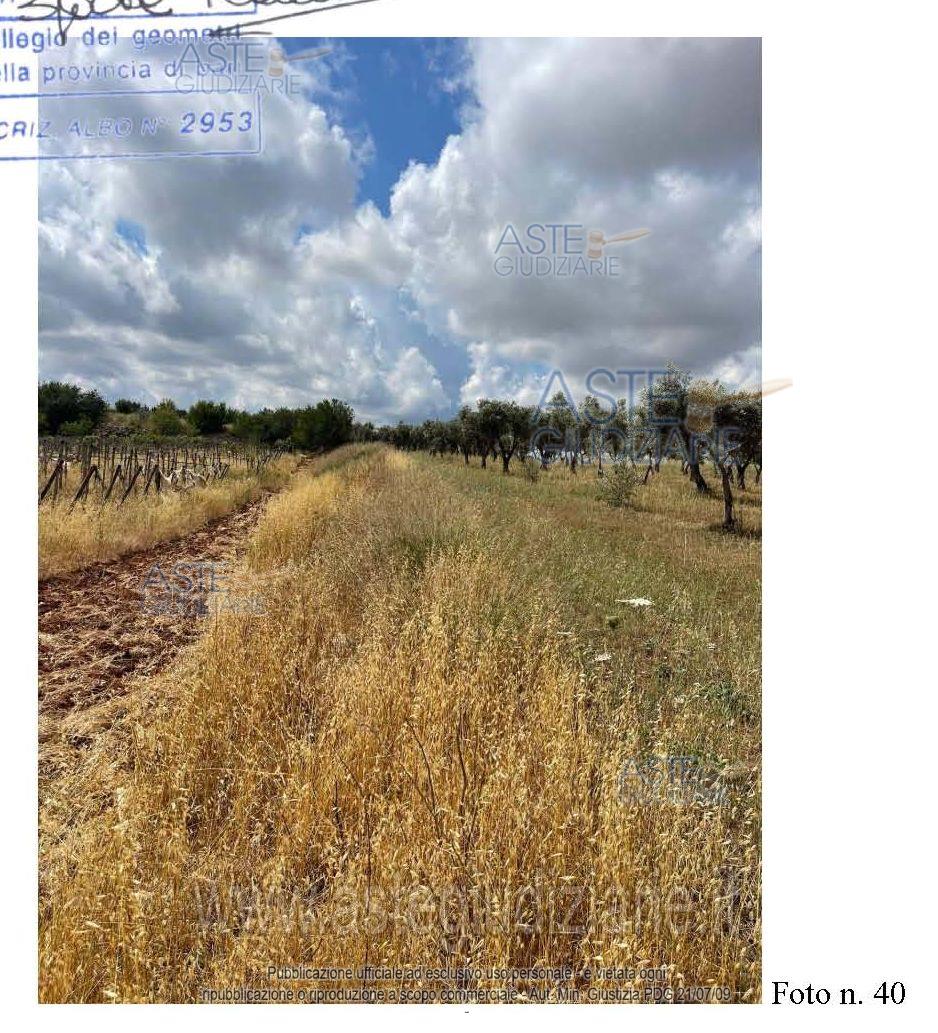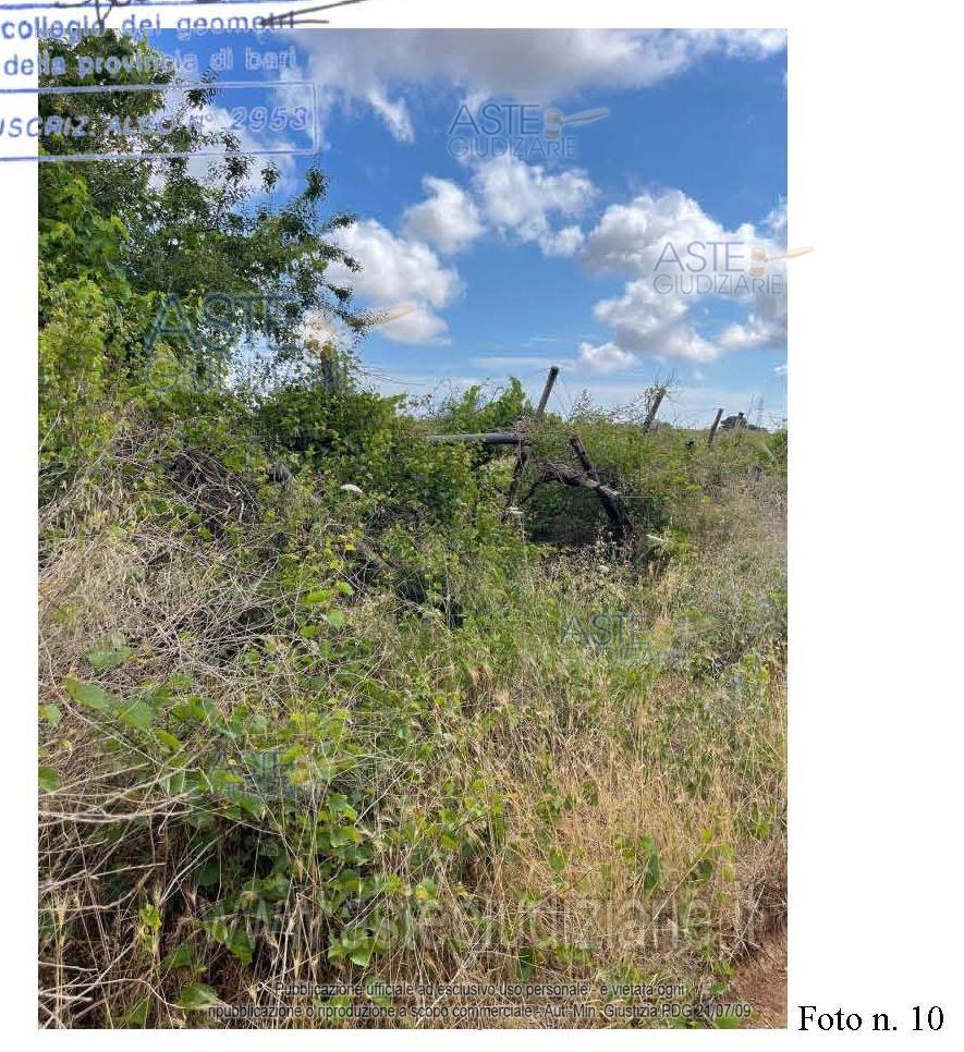 Pleine et parfaite propriété d'un terrain, d'une superficie totale d'environ 91 431 mètres carrés, situé dans la contrada "Martucci", ou "Foggia dell'Albero". Prezzo base € 95.736,00 (offerta minima € 95.736,00). Data inizio operazioni di vendita: 03/12/2025 ore 10:00. In caso di più offerte valide si procederà a gara che inizierà il 03/12/2025 ore 10:00 e terminerà il 10/12/2025 ore 10:00. Giudice Dott. Raffaella Simone. Rif. Tribunale di Bari - Nuovo concordato preventivo n. 37/2017