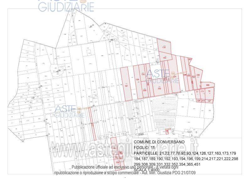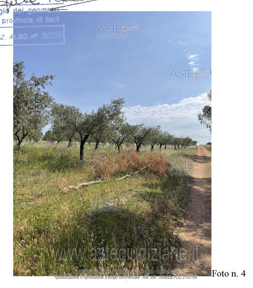 Vendita all'asta Senza incanto, con gara telematica asincrona - LOTTO 1(da A a V): LOT NO. 1 (A-B-C-D-E-F-G-H-I-L-M-N-O-P-Q-R-S-T-U-V) Full and exclusive ownership of a piece of land, cultivated as an olive grove, with a total area of approximately 42,841 square meters, located in the district "Martucci", district "Cecirale" or "San Bartolomeo", and district "La Petrosa". Prezzo base € 60.947,00 (offerta minima € 60.947,00). Data inizio operazioni di vendita: 03/12/2025 ore 10:00. In caso di più offerte valide si procederà a gara che inizierà il 03/12/2025 ore 10:00 e terminerà il 10/12/2025 ore 10:00. Giudice Dott. Raffaella Simone. Rif. Tribunale di Bari - Nuovo concordato preventivo n. 37/2017