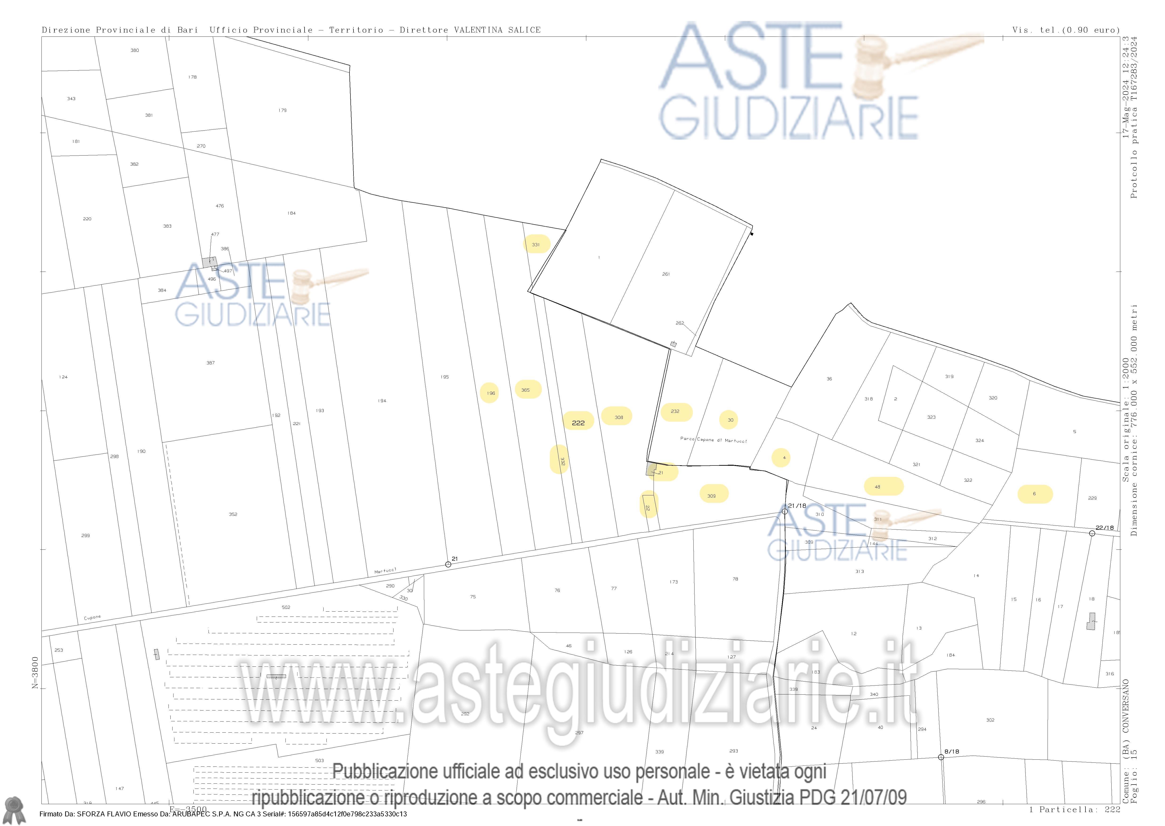 Vendita all'asta Senza incanto, con gara telematica asincrona - LOTTO 1(da A a V): LOT N. 1 (A-B-C-D-E-F-G-H-I-L-M-N-O-P-Q-R-S-T-U-V) Pleine et parfaite propriété d'un terrain, cultivé en oliveraie, d'une superficie totale d'environ 42 841 mètres carrés, situé à la contrada "Martucci", contrada "Cecirale" ou "San Bartolomeo", et contrada "La Petrosa". Prezzo base € 60.947,00 (offerta minima € 60.947,00). Data inizio operazioni di vendita: 03/12/2025 ore 10:00. In caso di più offerte valide si procederà a gara che inizierà il 03/12/2025 ore 10:00 e terminerà il 10/12/2025 ore 10:00. Giudice Dott. Raffaella Simone. Rif. Tribunale di Bari - Nuovo concordato preventivo n. 37/2017