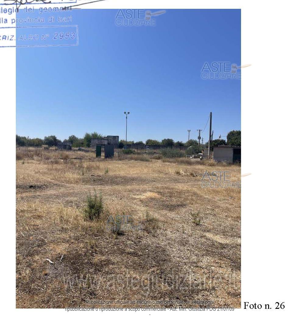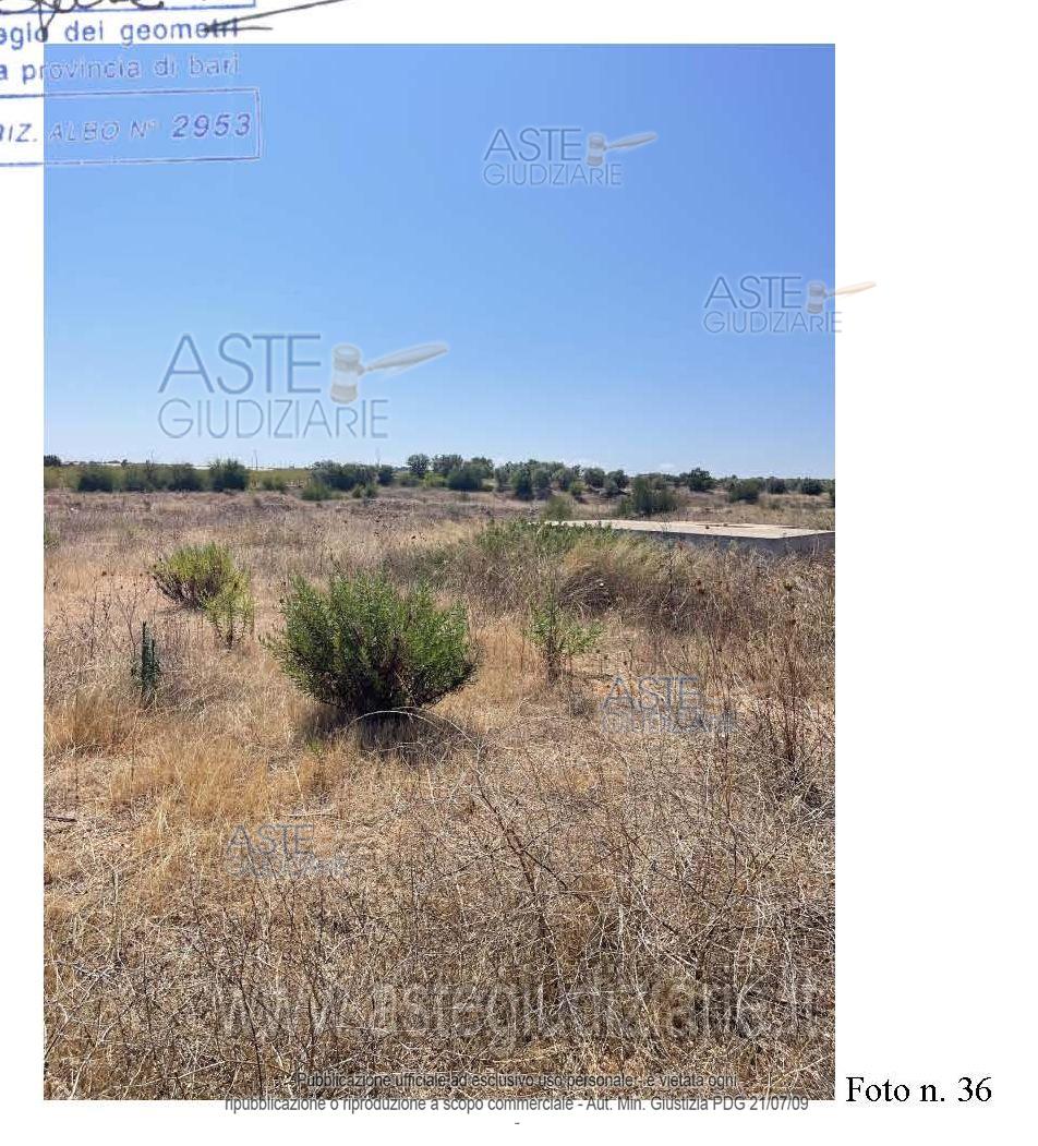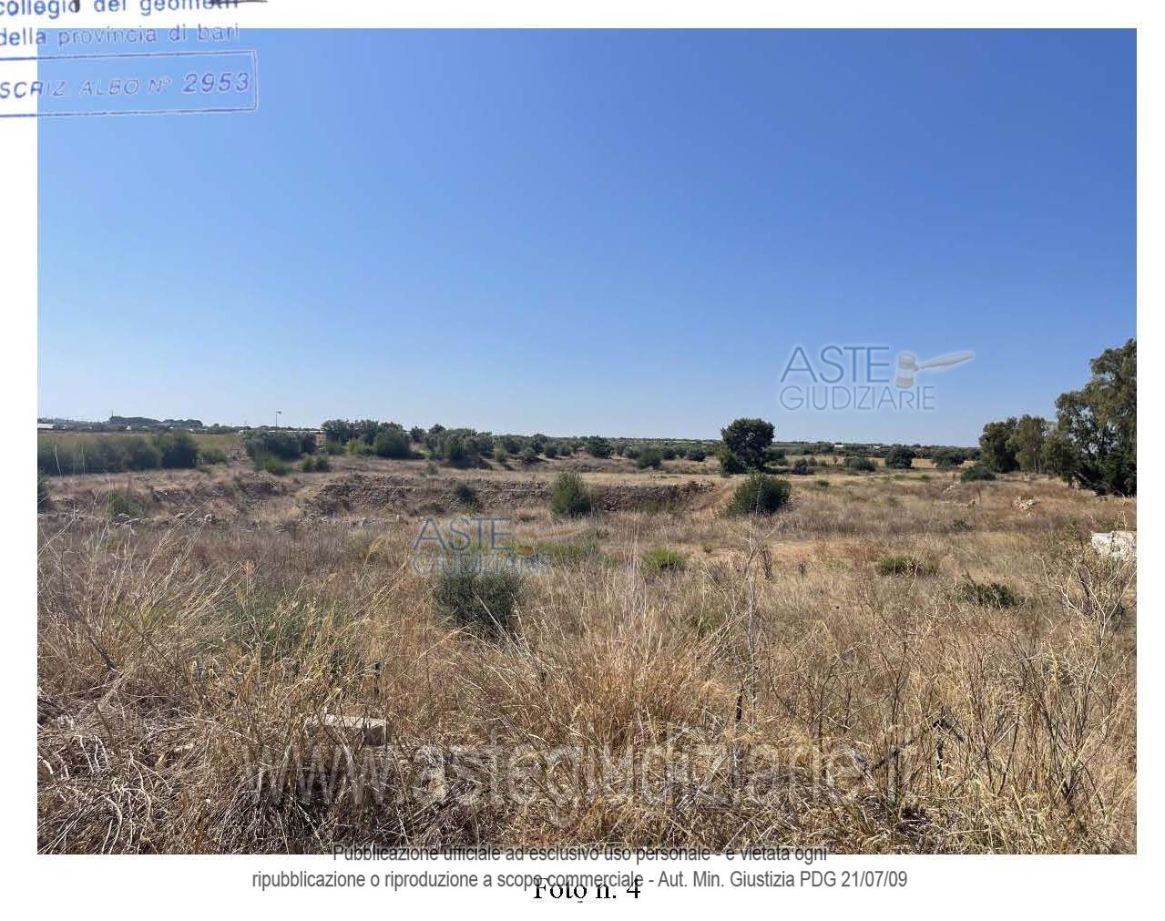 Pleine et parfaite propriété d'un terrain, d'une superficie totale d'environ 64 124 mètres carrés, situé dans les quartiers "Cireale" et "Martucci". Prezzo base € 17.348,00 (offerta minima € 17.348,00). Data inizio operazioni di vendita: 03/12/2025 ore 10:00. In caso di più offerte valide si procederà a gara che inizierà il 03/12/2025 ore 10:00 e terminerà il 10/12/2025 ore 10:00. Giudice Dott. Raffaella Simone. Rif. Tribunale di Bari - Nuovo concordato preventivo n. 37/2017