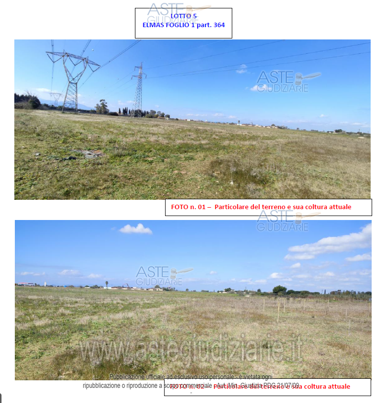 Vendita in attesa dell'emissione del nuovo bando d'asta. LOTTO 5: quota pari a 1/1 del diritto di proprietà sul Terreno edificabile ubicato a Elmas (CA) loc. "Is Arenas" - Via Orso Maria Corbino. Terreno attualmente ad uso agricolo, risulta inserito nel PUC in zona urbanistica per insediamenti produttivi commerciali, artigianali e industriali. identificato al catasto Terreni - Fg. 1, Part. 364. Ultimo prezzo base € 97.920,00 (offerta minima € 73.440,00). Giudice Valentina Frongia. Professionista delegato alla vendita Dott. Nicola Marcello. Custode Giudiziario Ivg Cagliari - Email "ivg.visiteimmobili@tiscali.it"; Cell. 0702299036. Rif. Tribunale di Cagliari - Esecuzione immobiliare post legge 80 n. 9/2009