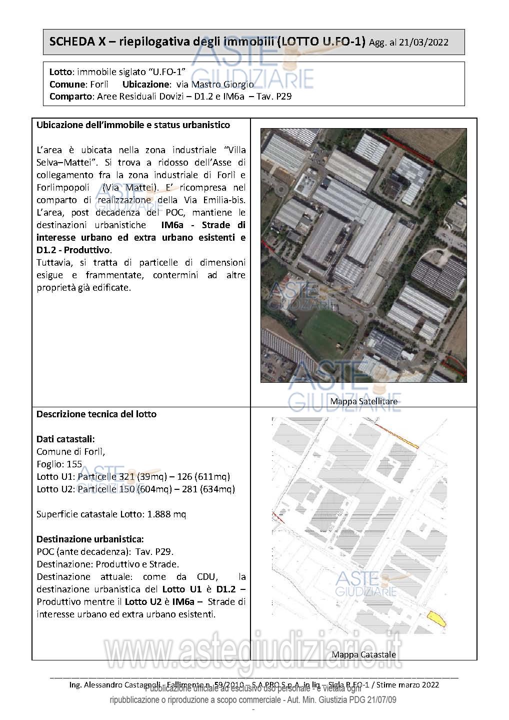 Vendita all'asta Senza incanto, con gara telematica asincrona - LOTTO 10: LOTTO U - Sottolotto U2 - Forlì – Aree residuali Dovizi 1Terreno sito nel comune di Forlì - via Mastro, via Casadei, Via del Santuario, superficie catastale 1.238 mq, destinazione uso "Viabilità- strade di interesse urbano ed extra urbano esistenti". Prezzo base € 8.000,00 (offerta minima € 7.000,00). Data inizio operazioni di vendita: 11/12/2025 ore 10:00. Giudice Dott. Barbara Vacca. Professionista delegato alla vendita Dott. Italo Bruno Vergallo. Rif. Tribunale di Forlì - Fallimentare (nuovo rito) n. 59/2010