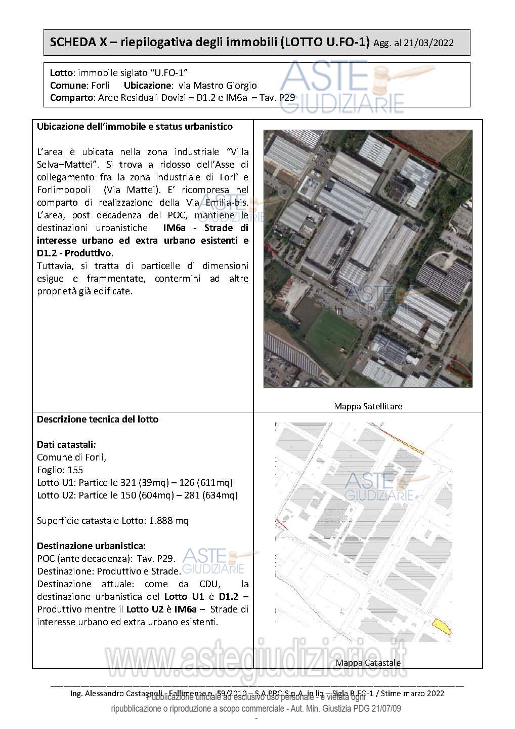 Vendita all'asta Senza incanto, con gara telematica asincrona - LOTTO 9: LOTTO U - Sottolotto U1 - Forlì – Aree residuali Dovizi 1Terreno sito nel comune di Forlì - via Mastro, via Casadei, Via del Santuario, superficie catastale 650 mq, destinazione uso produttivo D 1.2, indice Uf 0,60 mq/mq. Prezzo base € 4.000,00 (offerta minima € 3.500,00). Data inizio operazioni di vendita: 11/12/2025 ore 10:00. Giudice Dott. Barbara Vacca. Professionista delegato alla vendita Dott. Italo Bruno Vergallo. Rif. Tribunale di Forlì - Fallimentare (nuovo rito) n. 59/2010