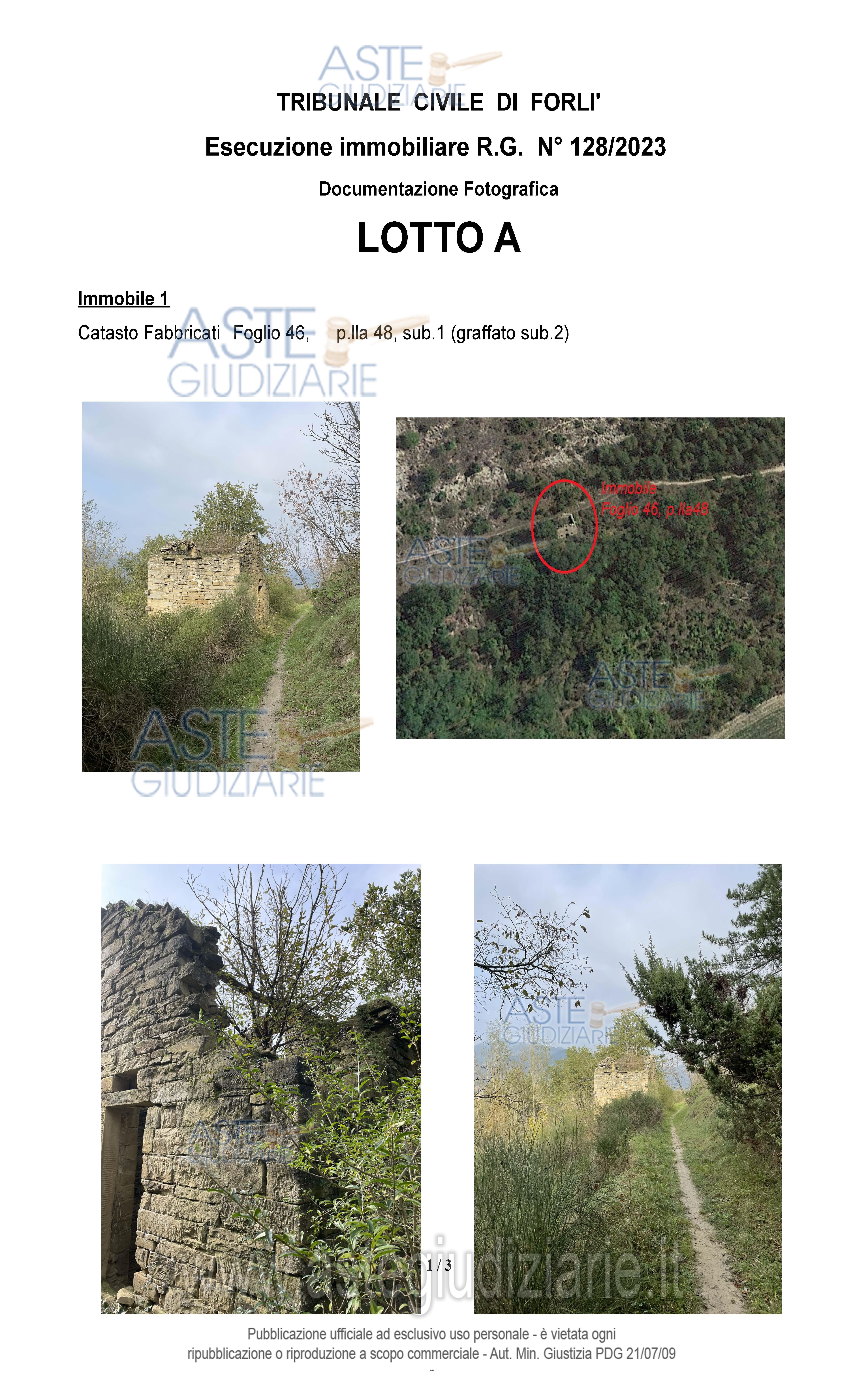 Vendita all'asta Senza incanto, con gara telematica asincrona - LOTTO UNICO: Lotto costituito da un rudere parzialmente crollato e inagibile, originariamente disposto su 3 livelli ciascuno di 30 mq e da terreni di complessivi 31.377 mq a destinazione agricola, per la maggior parte a bosco o pascolo. I terreni sono posti su appezzamenti collinari, privi di recinzione e delimitazioni e sono dislocati tra loro, separati da appezzamenti di altre proprietà. Sono difficilmente raggiungibili se non da sentieri e mulattiere. Prezzo base € 9.750,00 (offerta minima € 7.312,50). Data inizio operazioni di vendita: 29/01/2026 ore 10:30. Giudice Fabio Santoro. Professionista delegato alla vendita Dott. Costanza Mariani - Email "studio@studio-mariani.com"; Tel. 0543818248. Custode Giudiziario Dott. Costanza Mariani - Email "studio@studio-mariani.com"; Tel. 0543818248. Rif. Tribunale di Forlì - Espropriazione immobiliare (cartabia) n. 128/2023