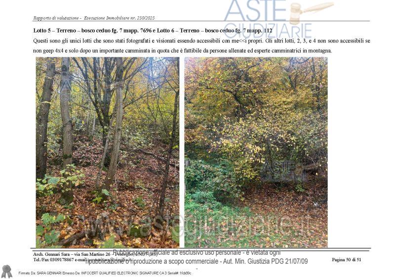 Vendita all'asta Senza incanto, con gara telematica asincrona - LOTTO 6: Bosco situato a sud est della Via Val di Sur. Prezzo base € 11.266,50 (offerta minima € 8.449,88). Data inizio operazioni di vendita: 01/04/2026 ore 11:00. Professionista delegato alla vendita Dott. Matteo Fedrigolli. Custode Giudiziario Dott. Matteo Fedrigolli - Email "info.bsimmobiliare@gmail.com"; Tel. 0305780453. Rif. Tribunale di Brescia - Espropriazione immobiliare (cartabia) n. 250/2025