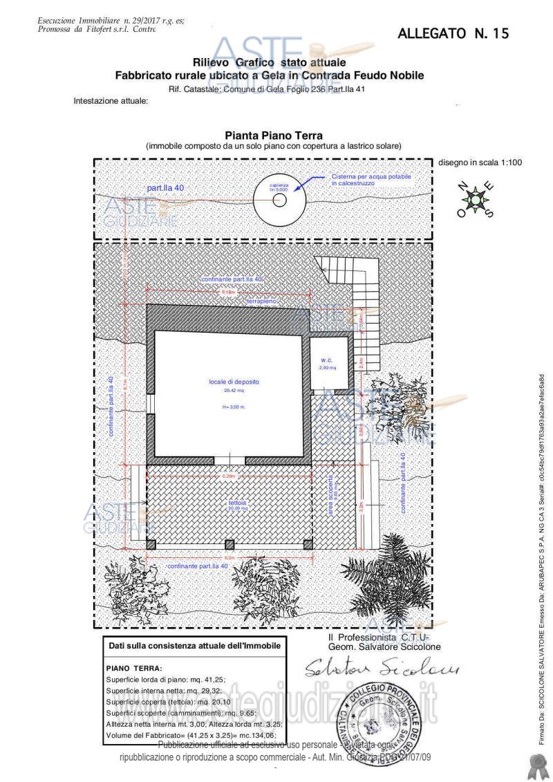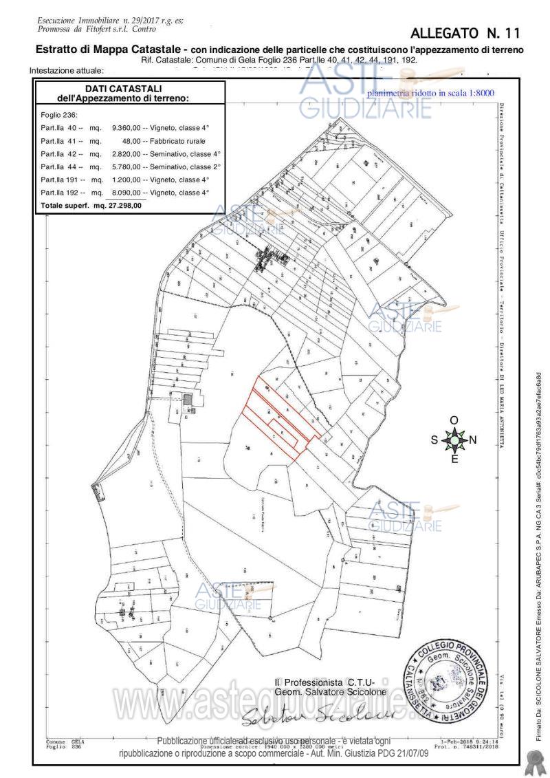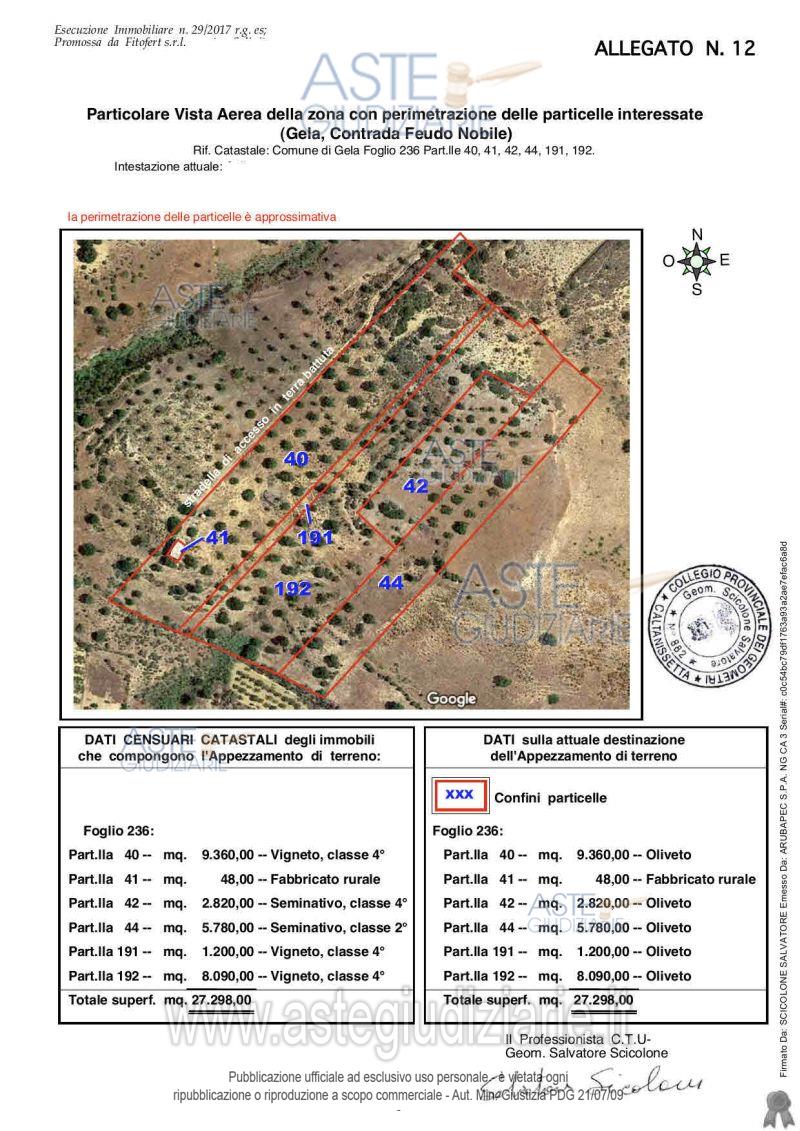 Vendita all'asta Senza incanto, con gara telematica sincrona mista - LOTTO 2: “Piena proprietà di terreno, con entrostante fabbr. rurale, in Gela (CL), c.da Feudo Nobile, superf. mq. 27.298, comp. da n. 6 immobili in cat. foglio 236: - p.lla 40, vign., cl. 4, mq 9.360, r.d. 48,34, r.a. 33,84; - p.lla 41, fabbr. rur., superf. mq 48, r.d. 0,00, r.a. 0,00; - p.lla 42, sem., cl. 4, mq 2.820, r.d. 6,55, r.a. 1,17; - p.lla 44, sem., cl. 4, mq 5.780, r.d. 13,43, r.a. 2,39; - p.lla 191, vign., cl. 4, mq 1.200, r.d. 6,20, r.a. 4,34; - p.lla 192, vign., cl. 4, mq 8.090, r.d. 41,78, r.a. 29,25". Prezzo base € 31.218,75 (offerta minima € 23.414,06). Data vendita 19/05/2026 ore 17:00. Professionista delegato alla vendita Avv. Aldo Giuseppe Bonadonna - Email "ag.bonadonna@virgilio.it"; Cell. 3392882159; Tel. 0934346462. Custode Giudiziario Avv. Aldo Giuseppe Bonadonna - Email "ag.bonadonna@virgilio.it"; Cell. 3392882159; Tel. 0934346462. Rif. Tribunale di Gela - Esecuzione immobiliare post legge 80 n. 29/2017