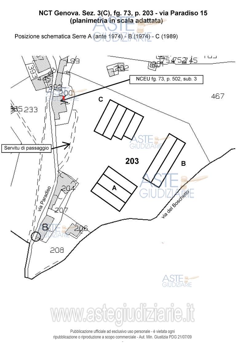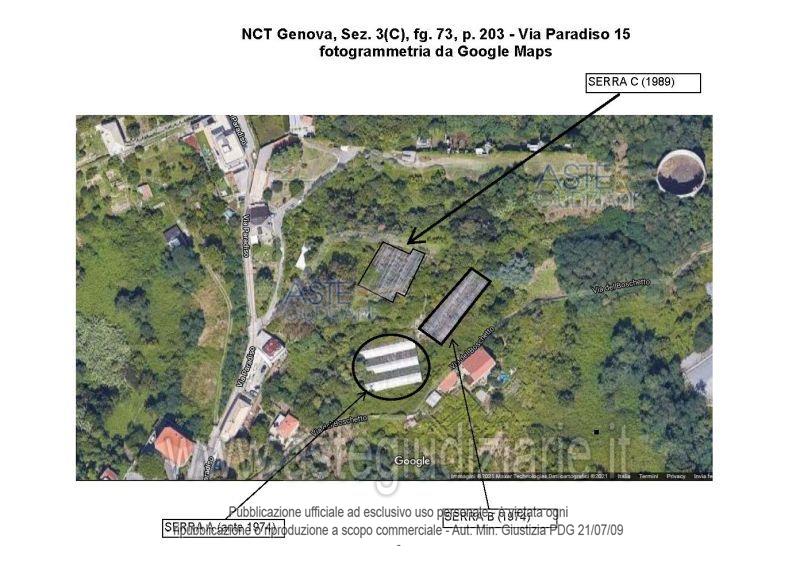 Vendita all'asta Senza incanto, con gara telematica sincrona mista - LOTTO UNICO: Piena proprietà di terreno in Genova, via Paradiso 15. Superficie convenzionale mq. 11000. Terreno non pianeggiante a destinazione orto-irriguo, caratterizzato dalla presenza di alberi e piante. Insistono su di esso tre serre a struttura metallica d'epoca diversa che comprono una superficie di circa mq. 800 l'una. Prezzo base € 39.790,06 (offerta minima € 29.842,55). Data vendita 19/12/2025 ore 14:00. Giudice Dott. Andrea Balba. Professionista delegato alla vendita Avv. Paolo Degola - Email "paolodegola@cevascodegola.com"; Tel. 0108177330. Custode Giudiziario Sovemo Srl - Email "immobiliare@sovemo.com". Rif. Tribunale di Genova - Esecuzione immobiliare post legge 80 n. 263/2020