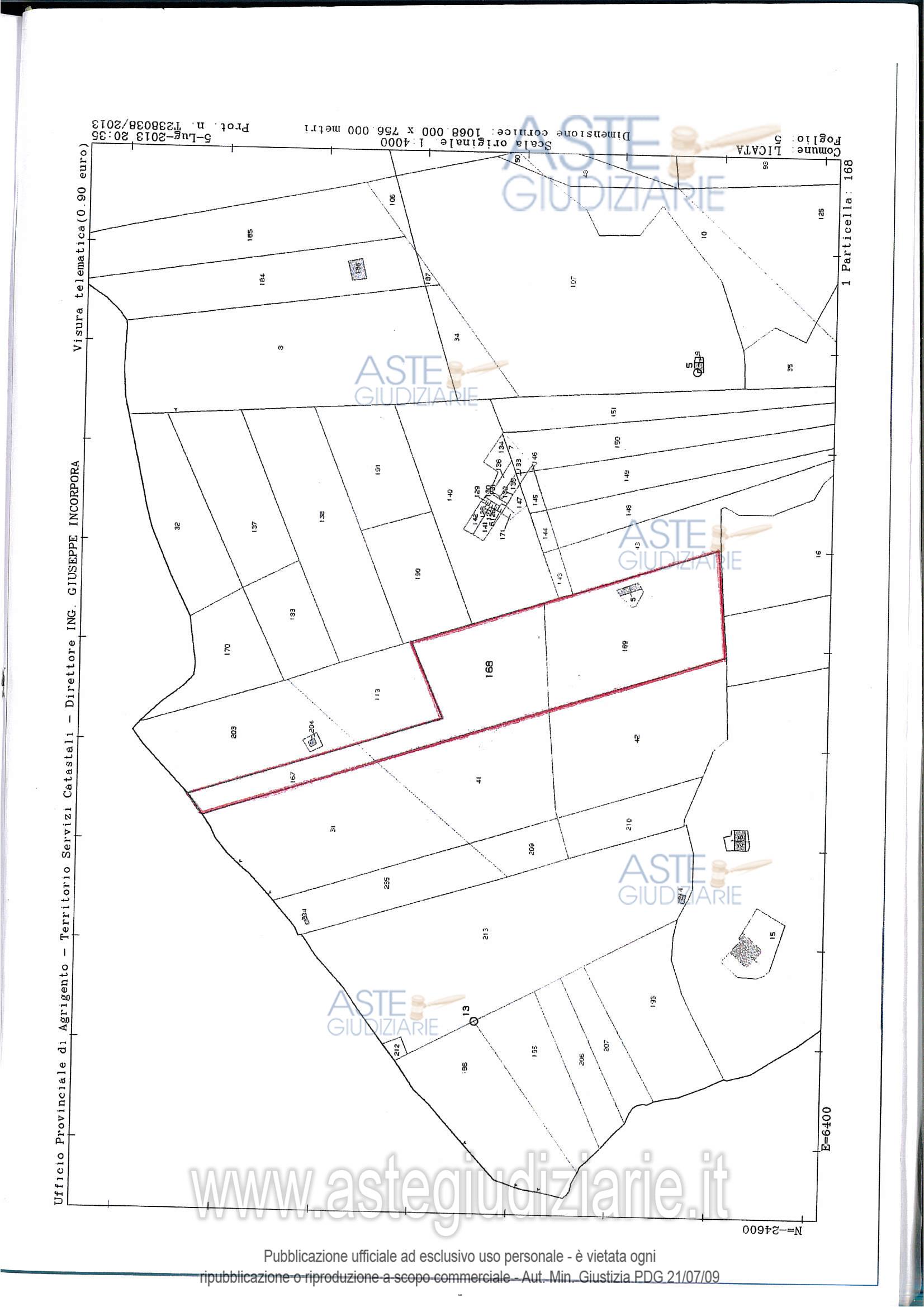 Vendita all'asta Senza incanto, con gara telematica sincrona mista - LOTTO 4: Piena proprietà per la quota di 1000/1000 di appezzamento di terreno agricolo con estensione complessiva di mq. 35.910, identificato al N. C. T. del Comune di Licata al foglio 5 e costituito dalle particelle 167, 168 e 169. L’area ricade, secondo le previsioni del P.R.G. nella zona “E – Agricola Generica”. Non sono presenti difformità urbanistico/edilizie e catastali. Apertura buste alle ore 16:00. Prezzo base € 16.127,77 (offerta minima € 12.095,82). Data vendita 29/01/2026 ore 19:00. Giudice Vitalba Marina Pipitone. Professionista delegato alla vendita Avv. Gianluca Fanara - Email "gianluca.fanara@hotmail.it"; Cell. 3288955258; Tel. 0922831851. Custode Giudiziario Avv. Gianluca Fanara - Email "gianluca.fanara@hotmail.it"; Cell. 3288955258; Tel. 0922831851. Rif. Tribunale di Agrigento - Esecuzione immobiliare post legge 80 n. 34/2011