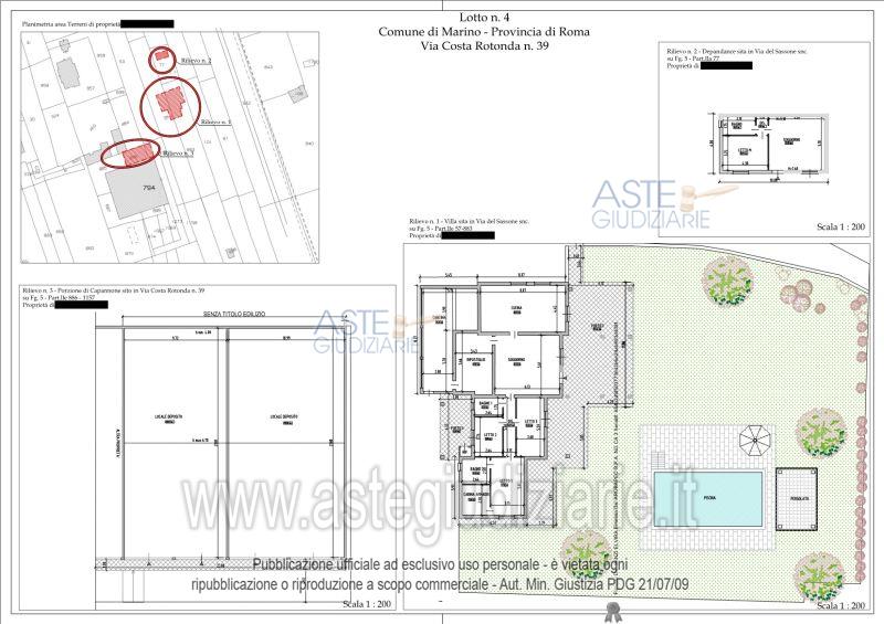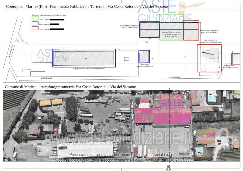 Vendita all'asta Senza incanto, con gara telematica asincrona - LOTTO 4: N.6 terreni agricoli per un totale di mq. 5.042,00 ubicati in Marino (RM), Via di Costa Rotonda e via del Sassone, località Frattocchie, qualità vigneto. Privi di colture e urbanizzati con piazzali, strade e aree a servizio di manufatti realizzati nel tempo. Su tali terreni insistono porzione di capannone industriale di circa 455,50 mq, villa unifamiliare di circa 156 mq con giardino, piscina, solarium e pergola, dependance di circa mq 50.00 mq. Tutti privi di titolo edilizio. Prezzo base € 85.000,00 (offerta minima € 63.750,00). Data inizio operazioni di vendita: 27/02/2026 ore 10:30. Giudice Dott. Raffaella Calvanese. Professionista delegato alla vendita Avv. Sara Di Geronimo. Custode Giudiziario Avv. Sara Di Geronimo - Email "info@studiodigeronimo.com"; Tel. 0694018070. Rif. Tribunale di Velletri - Espropriazione immobiliare (cartabia) n. 67/2024