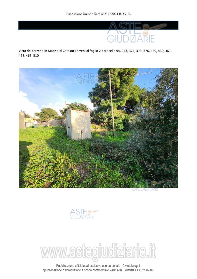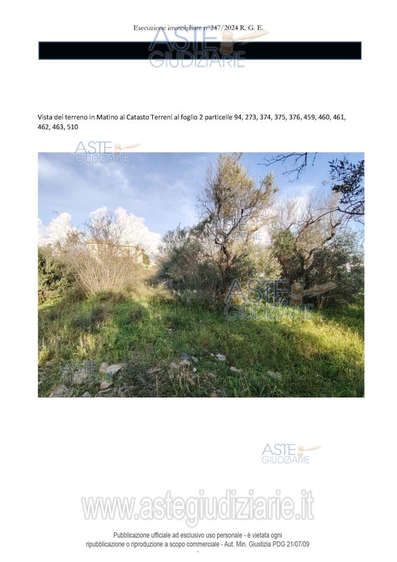 Vendita all'asta Senza incanto, con gara telematica asincrona - LOTTO 3: Terreno in parte edificabile e parte agricolo di rispetto a MATINO contrada La Marca, della superficie commerciale di 4.334,00 mq per la quota di 1/1 di piena proprietà. Prezzo base € 50.362,50 (offerta minima € 37.771,87). Data inizio operazioni di vendita: 06/05/2026 ore 12:00. Giudice Dott. Anna Francesca Capone. Professionista delegato alla vendita Avv. Gabriele Toma - Tel. 3493932555 - 3928274. Custode Giudiziario Avv. Gabriele Toma - Tel. 3493932555 - 3928274. Rif. Tribunale di Lecce - Esecuzione immobiliare n. 247/2024