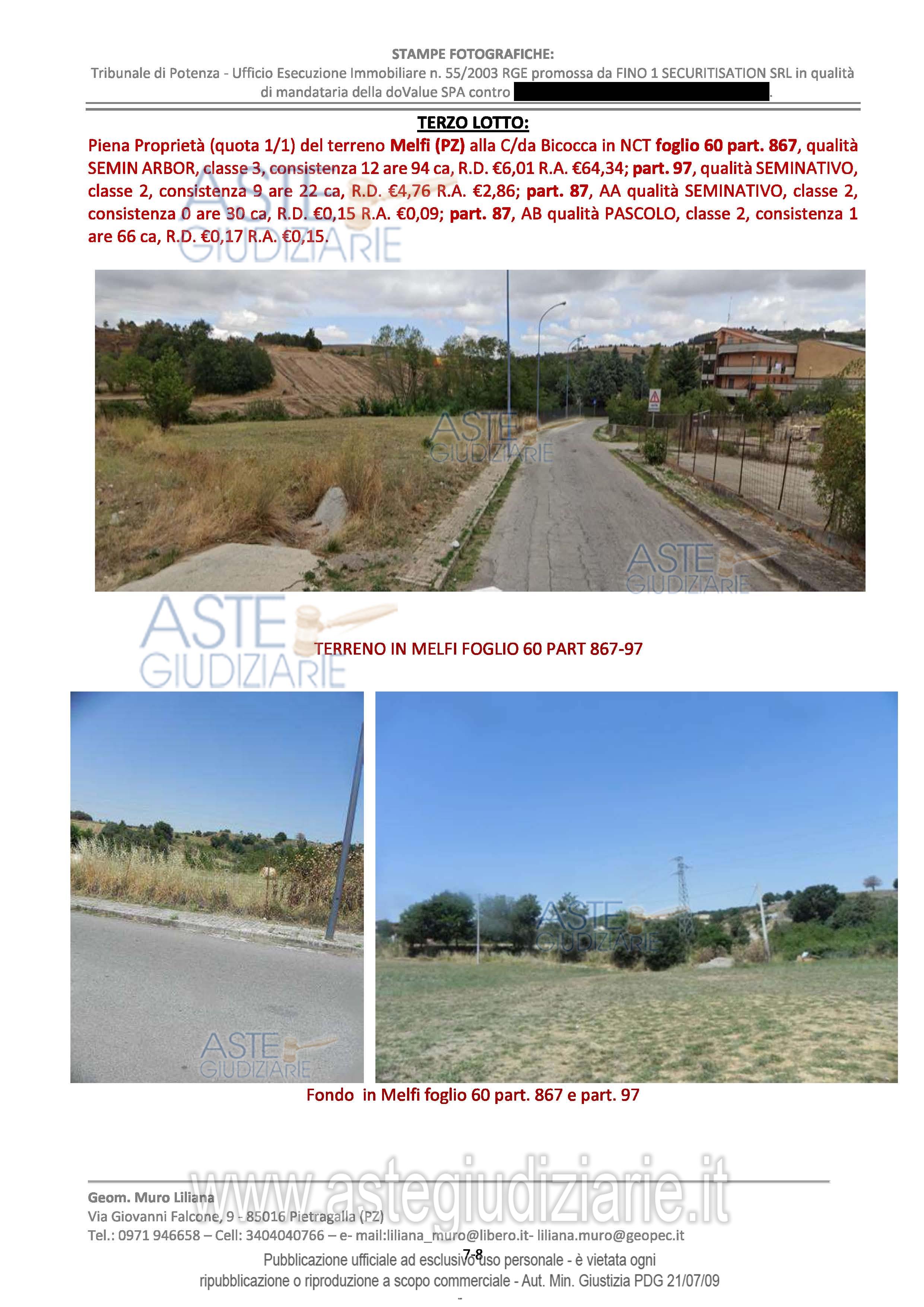 Vendita all'asta Senza incanto - LOTTO 3: Diritto di piena proprietà (quota 1/1) in Melfi (PZ) alla C/da Bicocca di TERRENO al Foglio 60 part.lla 867, semi/arbor, cl. 3, 12 are 94 ca, R.D. € 6,01 R.A. € 64,34; TERRENO al Foglio 60 part.lla 97, eminativo, cl. 2, 9 are 22 ca, R.D. € 4,76 R.A. € 2,86; TERRENO al Foglio 60 part.lla 87, AA seminativo, cl. 2, 0 are 30 ca, R.D. € 0,15 R.A. €0,09; TERRENO al Foglio 60 part.lla 87, AB pascolo, cl. 2, 1 are 66 ca, R.D. € 0,17 R.A. €0,15. Prezzo base € 3.256,00 (offerta minima € 2.442,00). Data vendita 20/06/2026 ore 09:30. Professionista delegato alla vendita: Avv. Antonio Calice - Email "studiocalice@virgilio.it"; Tel. 0972/720015; Cell. 335/6090455.