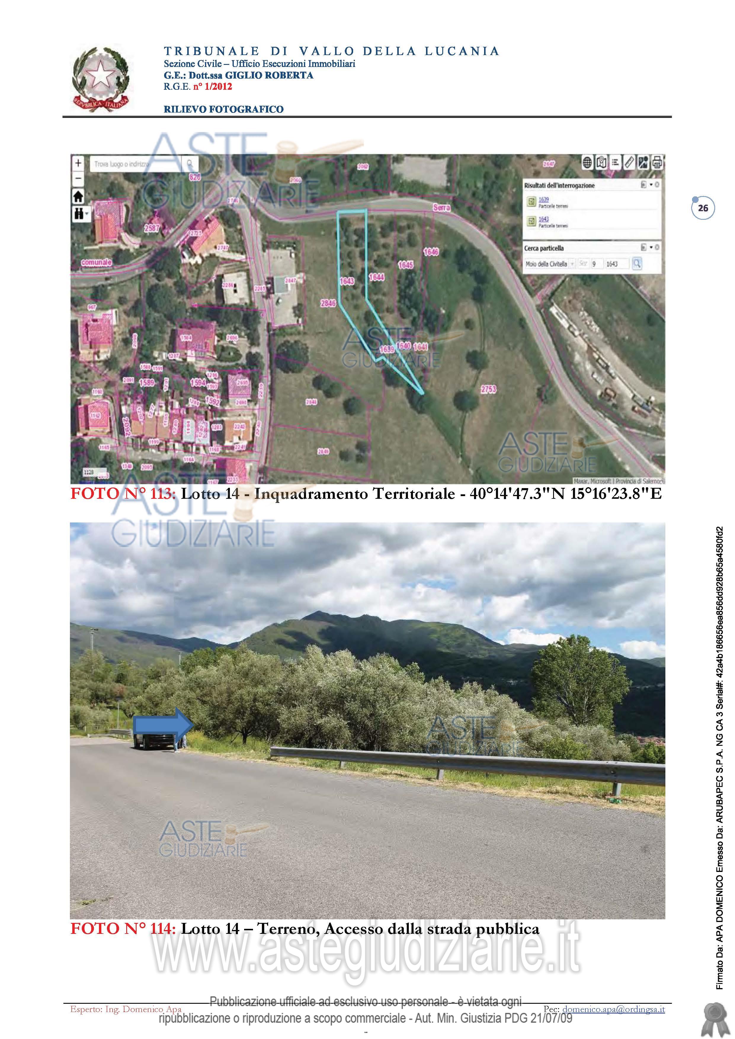 Vendita all'asta Senza incanto, con gara telematica asincrona - LOTTO 14: Terreni. Prezzo base € 46.000,00 (offerta minima € 34.500,00). Data inizio operazioni di vendita: 25/03/2026 ore 11:00. Giudice Roberta Giglio. Professionista delegato alla vendita Dott. Pietro Di Lorenzo. Custode Giudiziario Dott. Pietro Di Lorenzo - Email "pietro-dilorenzo@outlook.it". Rif. Tribunale di Vallo della Lucania - Esecuzione immobiliare post legge 80 n. 1/2012