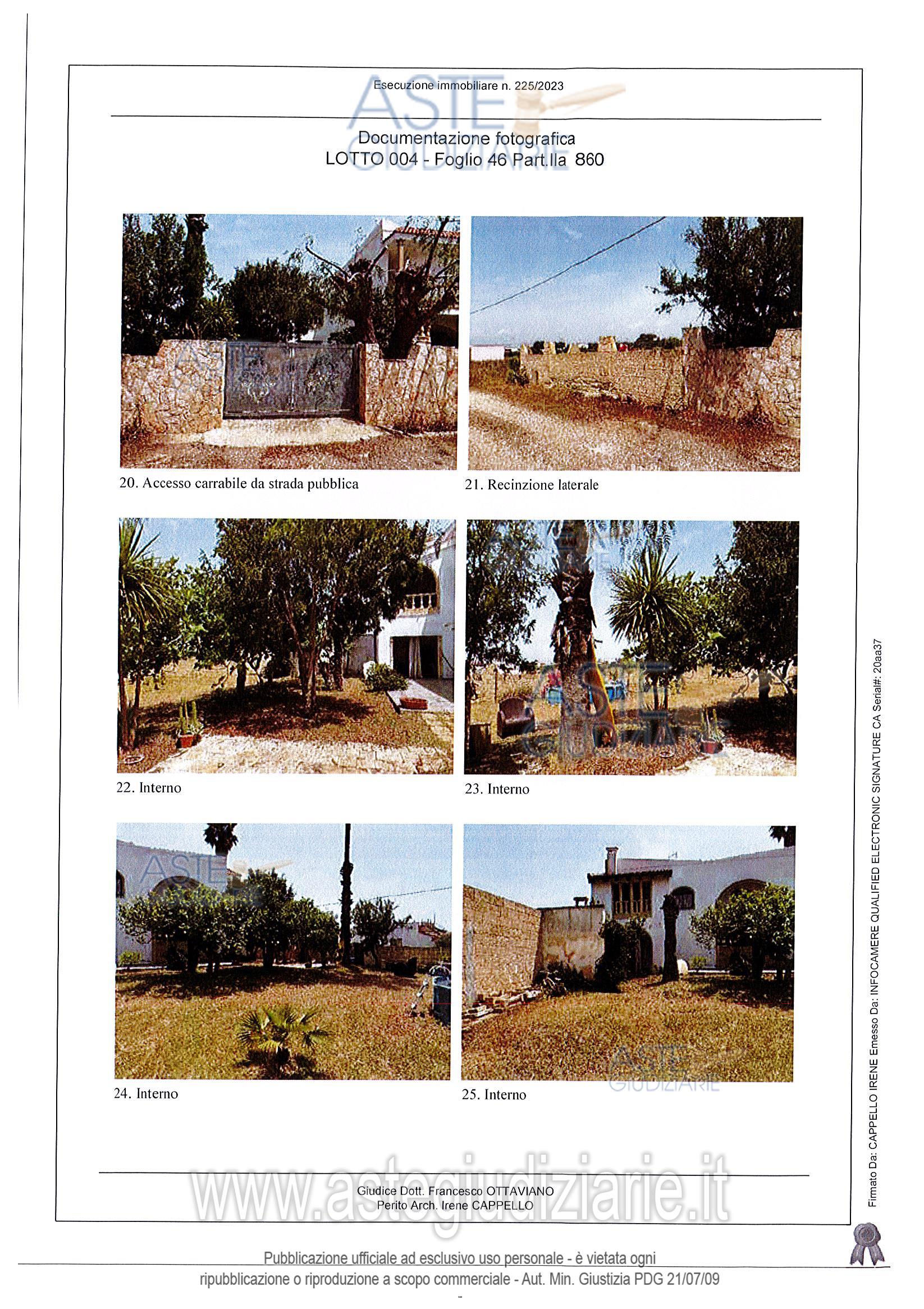Vendita all'asta Senza incanto, con gara telematica asincrona - LOTTO 4: Terreno agricolo a Nardò via Capri 19, della superficie commerciale di 460,00mq per la quota di 1/2 di piena proprietà. Prezzo base € 7.762,50 (offerta minima € 5.821,87). Data inizio operazioni di vendita: 16/01/2026 ore 10:00. Professionista delegato alla vendita Dott. Giovanni De Matteis - Email "studiodematteisg@libero.it"; Cell. 3402514360. Custode Giudiziario Dott. Giovanni De Matteis - Email "studiodematteisg@libero.it"; Cell. 3402514360. Rif. Tribunale di Lecce - Espropriazione immobiliare (cartabia) n. 225/2023