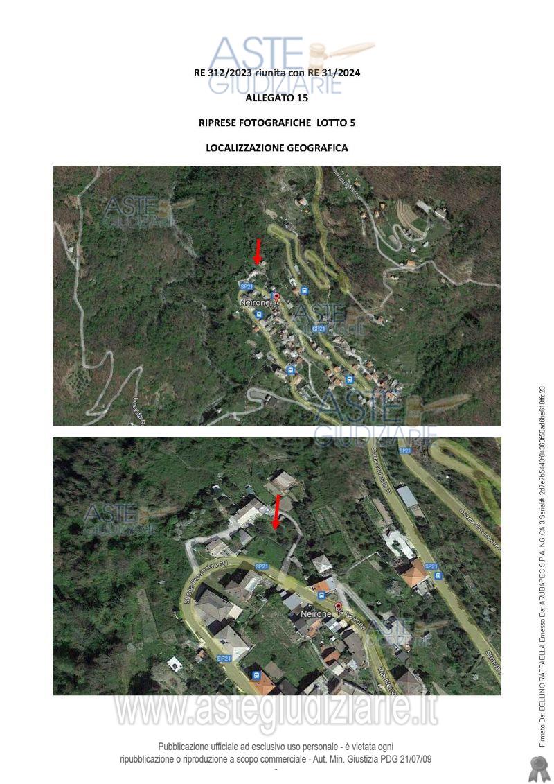 Vendita all'asta Senza incanto, con gara telematica sincrona mista - LOTTO 5: Terreno censito al Catasto dei Terreni di Neirone (GE), foglio 41, part. 61, qualità seminativo arborato, classe 2, superficie 490 mq, reddito domenicale Euro 2,29-, reddito agrario Euro 2,40-. Prezzo base € 11.000,00 (offerta minima € 8.250,00). Data vendita 22/04/2026 ore 14:00. Professionista delegato alla vendita Avv. Ernesto De Sanctis - Email "sldesanctis@gmail.com"; Tel. 0102543619. Custode Giudiziario Dott. Sovemo Srl - Email "immobiliare@sovemo.it"; Tel. 0105299253. Rif. Tribunale di Genova - Espropriazione immobiliare (cartabia) n. 312/2023