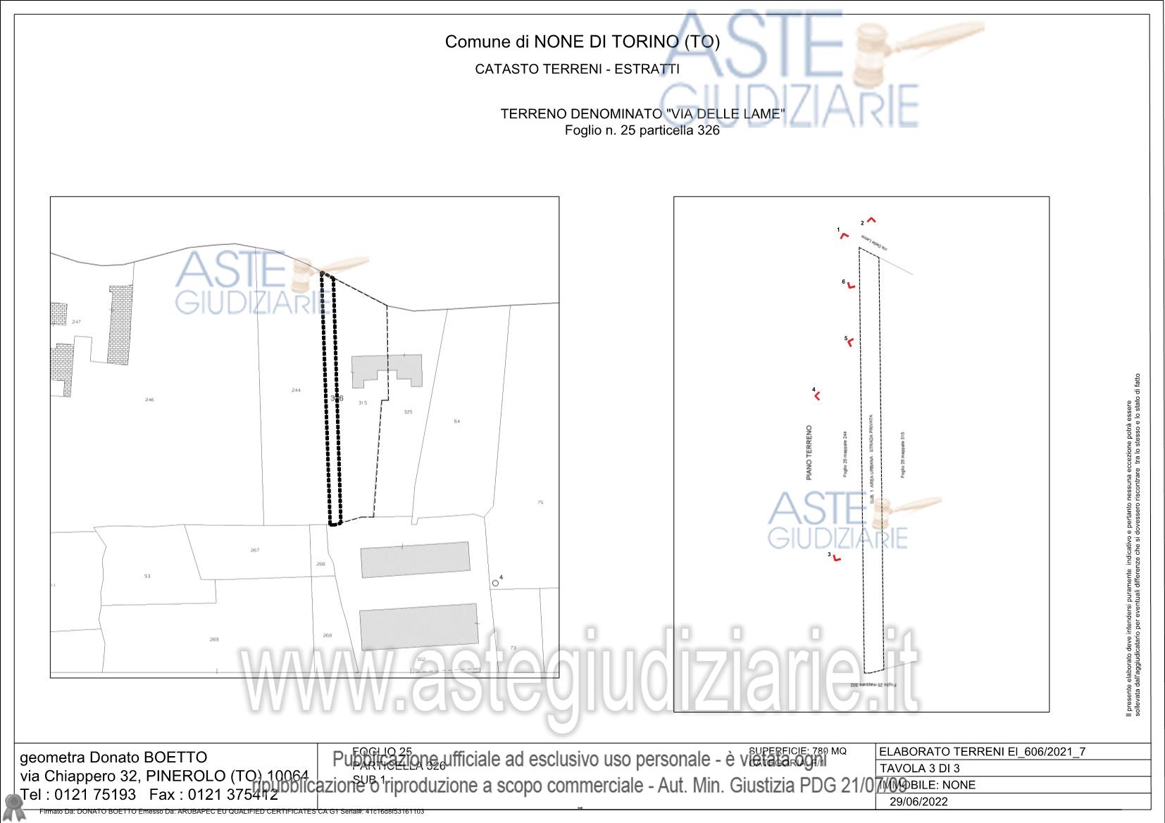 Vendita all'asta Senza incanto, con gara telematica asincrona - LOTTO 06: Appezzamento di terreno vincolato a standard con superficie commerciale di metri quadrati 742, avente accesso diretto dalla proprietà adiacente di terzi e di fatto pertinenziale ad altro fabbricato non oggetto del Procedimento esecutivo immobiliare.Censito in Catasto Fabbricati al Foglio 25, particella n. 326 sub 1, via della Lame n. 52, piano T, area urbana di metri quadrati 742, senza reddito, alle coerenze: Via delle Lame (strada Provinciale SP 140) e mappali numeri 244, 315 e 302 tutti del foglio 25. Prezzo base € 6.500,00 (offerta minima € 4.875,00). Data inizio operazioni di vendita: 21/04/2026 ore 15:30. Giudice Dott. D'addato. Professionista delegato alla vendita Dott. Ferrari Loranzi - Tel. 0114473790. Custode Giudiziario Ifir Piemonte Ivg Srl - Email "richieste.visite@ivgpiemonte.it"; Tel. 011482822. Rif. Tribunale di Torino - Esecuzione immobiliare post legge 80 n. 606/2021