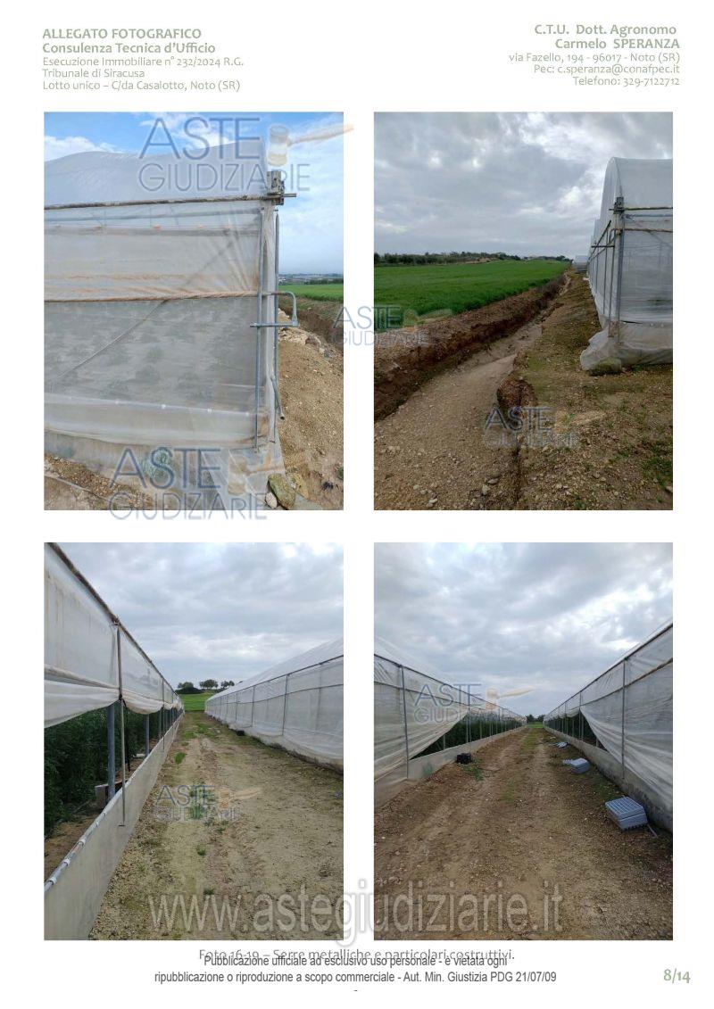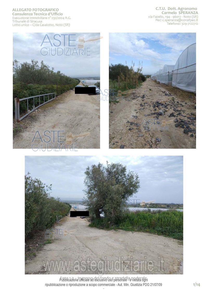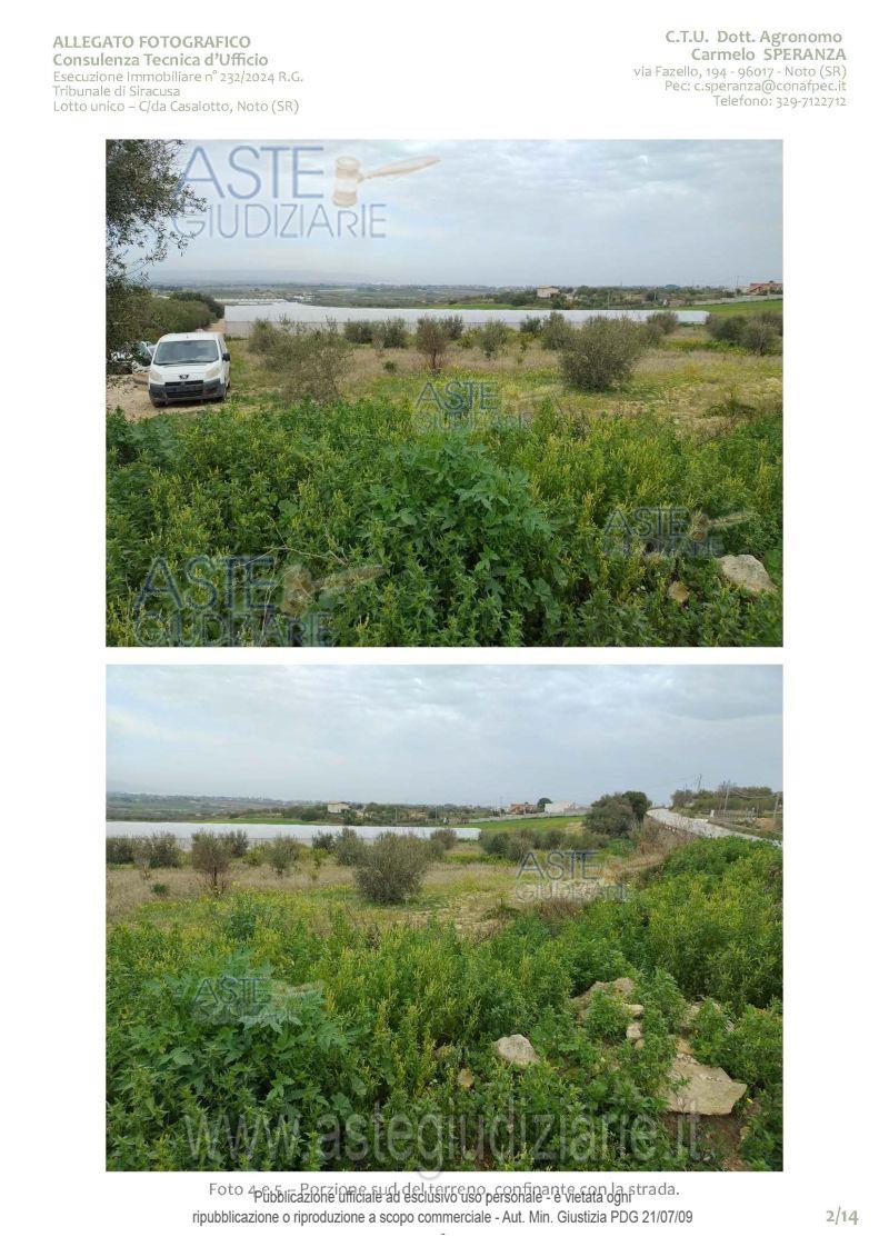 Vendita all'asta Senza incanto, con gara telematica sincrona mista - LOTTO UNICO: 1/1 Proprietà terreni agricoli in territorio di Noto, C.da Casalotto, censiti al C.T. del Comune di Noto, al foglio 421: p.lla 58, are 21, centiare 60; p.lla 129, are 77, centiare 40; p.lla 163, are 63, centiare 20; p.lla 190, ettari 1, are 26, centiare 30; p.lla 191, are 60, centiare 70; p.lla 192, are 55, centiare 30; p.lla 218, are 29, centiare 80; p.lla 238, are 55, centiare 40, per un totale di 48.970 m2, pari a 4 ettari, 89 are e 70 centiare, destinazione urbanistica Zona “E” Agricola. Prezzo base € 341.250,00 (offerta minima € 255.937,50). Data vendita 27/05/2026 ore 13:00. Giudice Maria Cristina Di Stazio. Professionista delegato alla vendita Avv. Fabio Condorelli - Email "fabiocondorelli76@gmail.com"; Cell. 3286214460; Tel. 0931976830. Custode Giudiziario Avv. Fabio Condorelli - Email "fabiocondorelli76@gmail.com"; Cell. 3286214460; Tel. 0931976830. Rif. Tribunale di Siracusa - Esecuzione immobiliare post legge 80 n. 232/2024