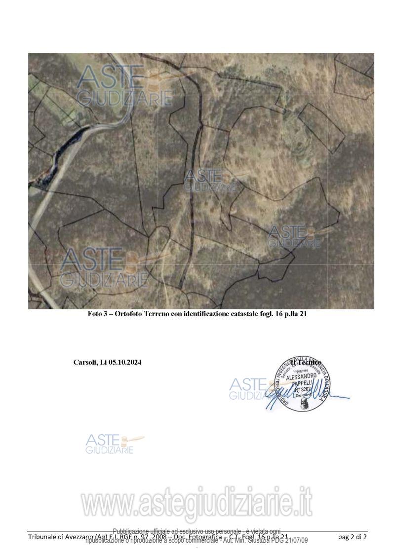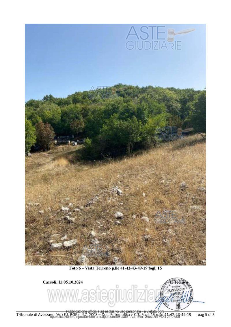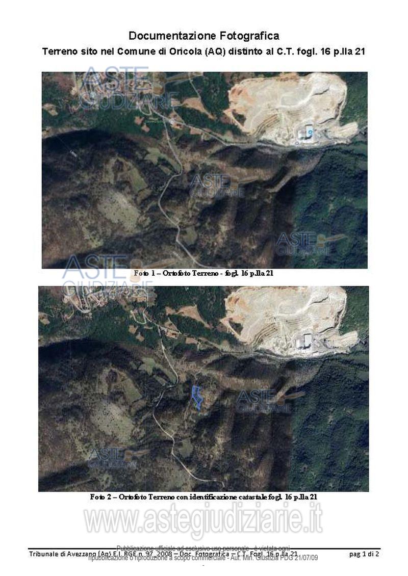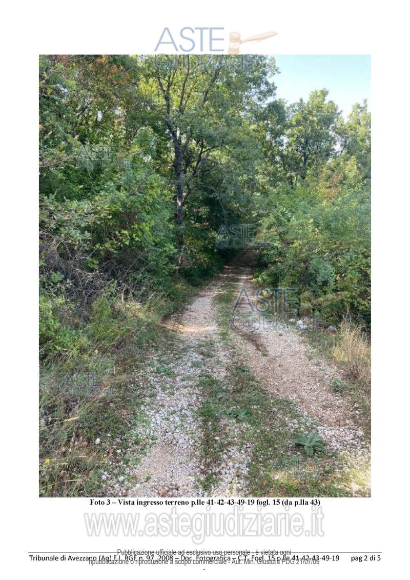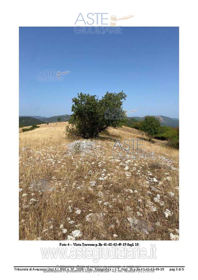 Vendita all'asta Senza incanto, con gara telematica asincrona - LOTTO 8: Terreni siti in Oricola presso traversa di via Quartiere, fg. 15 p.lle 19,41,42,43 e 49 e fg.16 p.lla 21. Prezzo base € 15.000,00 (offerta minima € 11.250,00). Data inizio operazioni di vendita: 26/05/2026 ore 15:00. Professionista delegato alla vendita Avv. Roberto Walter Berardini - Email "roberto.berardini@virgilio.it"; Cell. 3490608911; Tel. 0863444247. Custode Giudiziario Avv. Roberto Walter Berardini - Email "roberto.berardini@virgilio.it"; Cell. 3490608911; Tel. 0863444247. Rif. Tribunale di Avezzano - Esecuzione immobiliare post legge 80 n. 97/2008