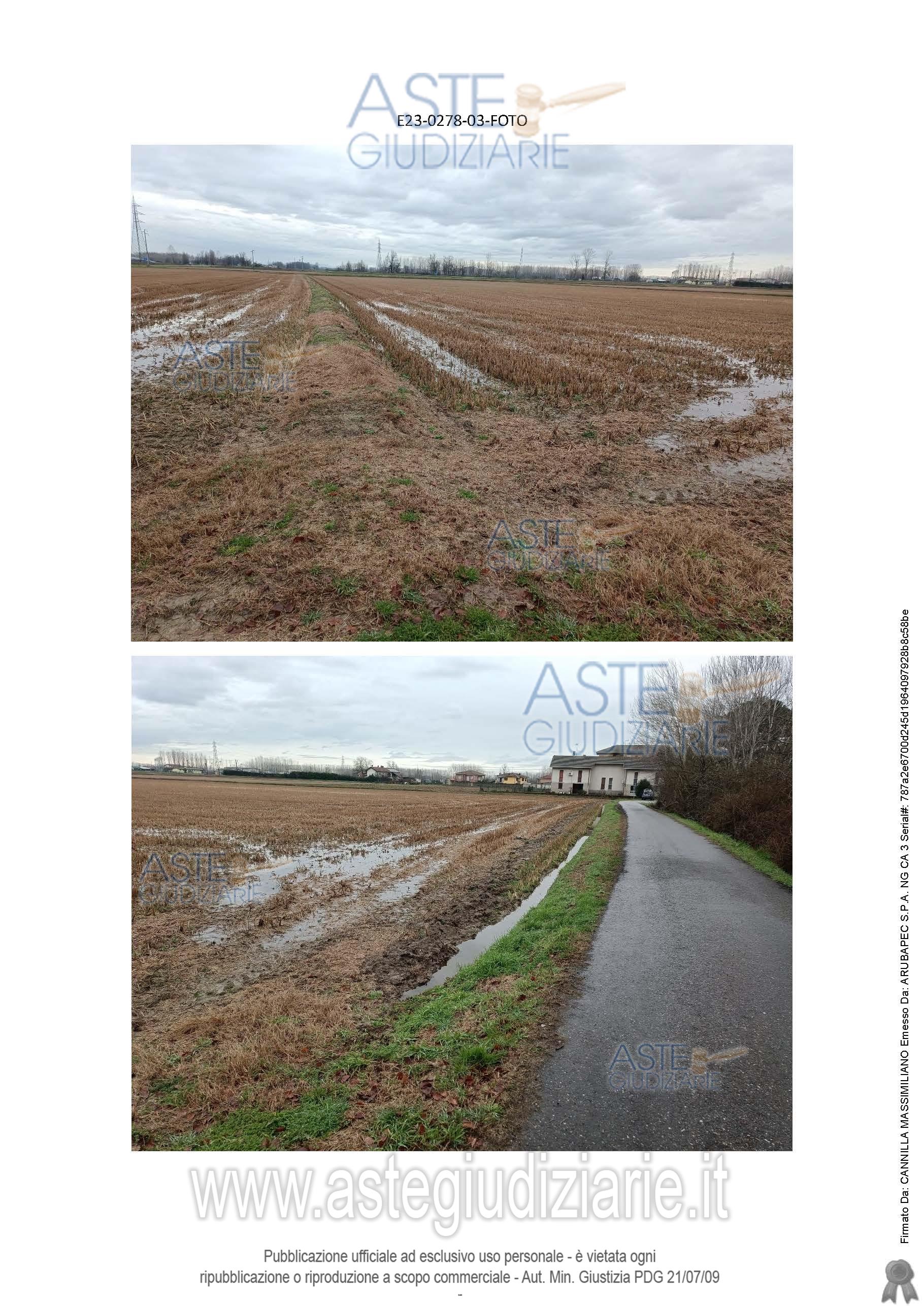 Vendita all'asta Senza incanto, con gara telematica asincrona - LOTTO 3: Appezzamenti di terreno agricolo, con accesso da Via Marinino, censiti a Catasto Terreni come segue:foglio 2, mappale 121, di are 69.13, R.D. Euro 117,82, R.A. Euro 42,84;foglio 2, mappale 128, di are 22.94, R.D. Euro 26,66, R.A. Eu-ro 14,22. Prezzo base € 8.606,25 (offerta minima € 6.454,69). Data inizio operazioni di vendita: 26/05/2026 ore 10:00. Giudice Francesca Paola Claris Appiani. Professionista delegato alla vendita Not. Luisa Cellerino - Email "lcellerino@notariato.it". Custode Giudiziario Istituto Vendite Giudiziarie Di Vigevano - Email "immobiliarivigevano@ifir.it"; Tel. 0381691137. Rif. Tribunale di Pavia - Espropriazione immobiliare (cartabia) n. 278/2023