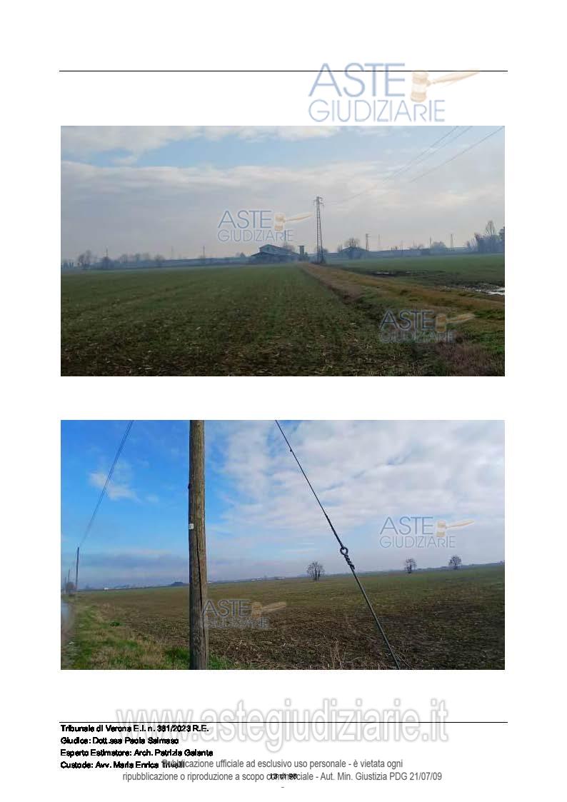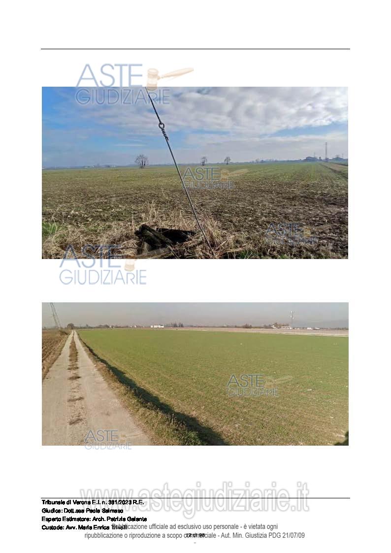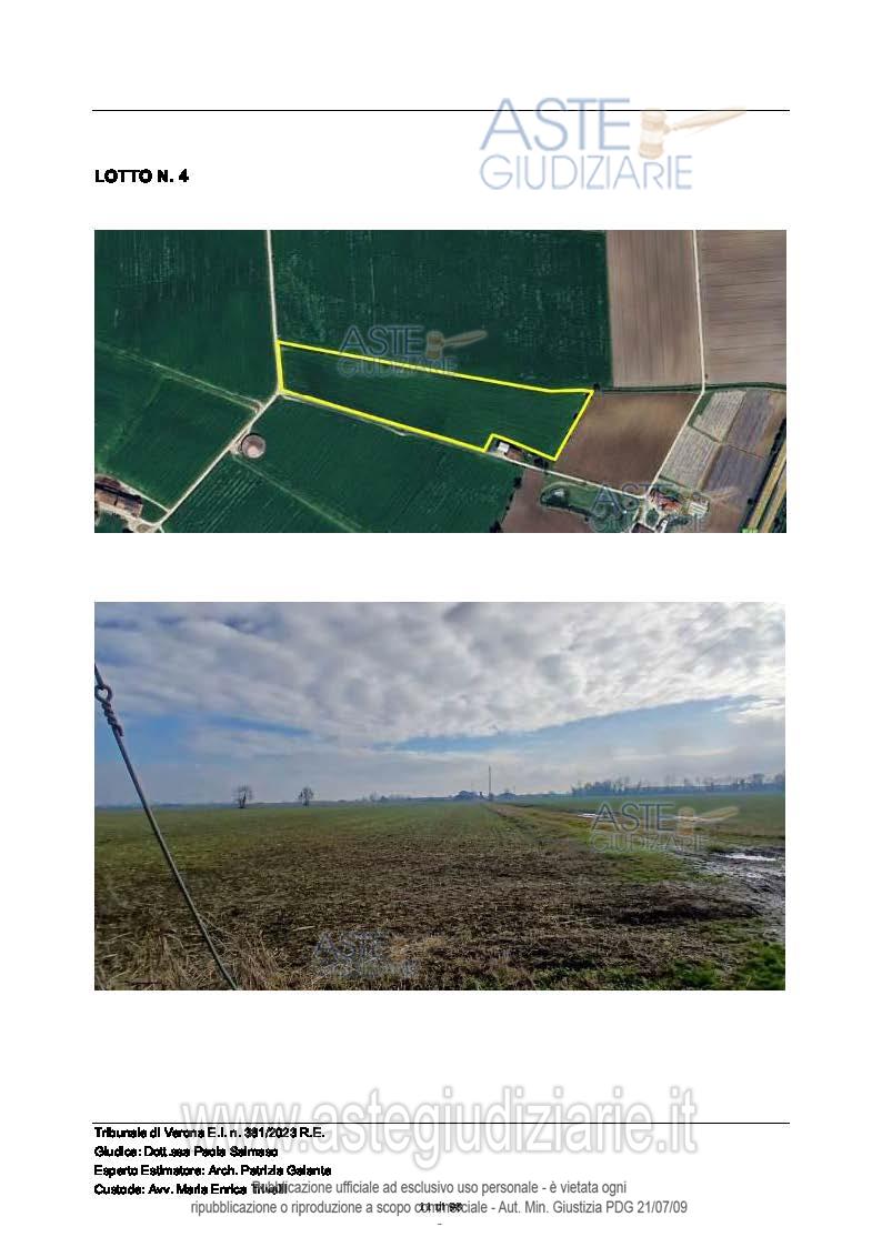 Vendita all'asta Senza incanto, con gara telematica sincrona mista - LOTTO 4: Tra i Comuni di Povegliano V.se e Vigasio, Località Ronchi, piena proprietà di fondo rustico della superficie catastale complessiva pari a 37.120 mq. Prezzo base € 127.000,00 (offerta minima € 95.250,00). Data vendita 04/02/2026 ore 14:30. Giudice Dott. Paola Salmaso. Professionista delegato alla vendita Not. Giovanni Calvelli - Email "segreteria@notaiveronesiassociati.it"; Tel. 0458530137. Custode Giudiziario Avv. Maria Enrica Trivelli - Email "mariaenrica.trivelli@gmail.com"; Tel. 045592599. Rif. Tribunale di Verona - Espropriazione immobiliare (cartabia) n. 381/2023