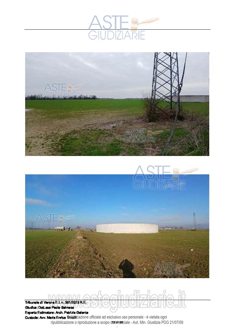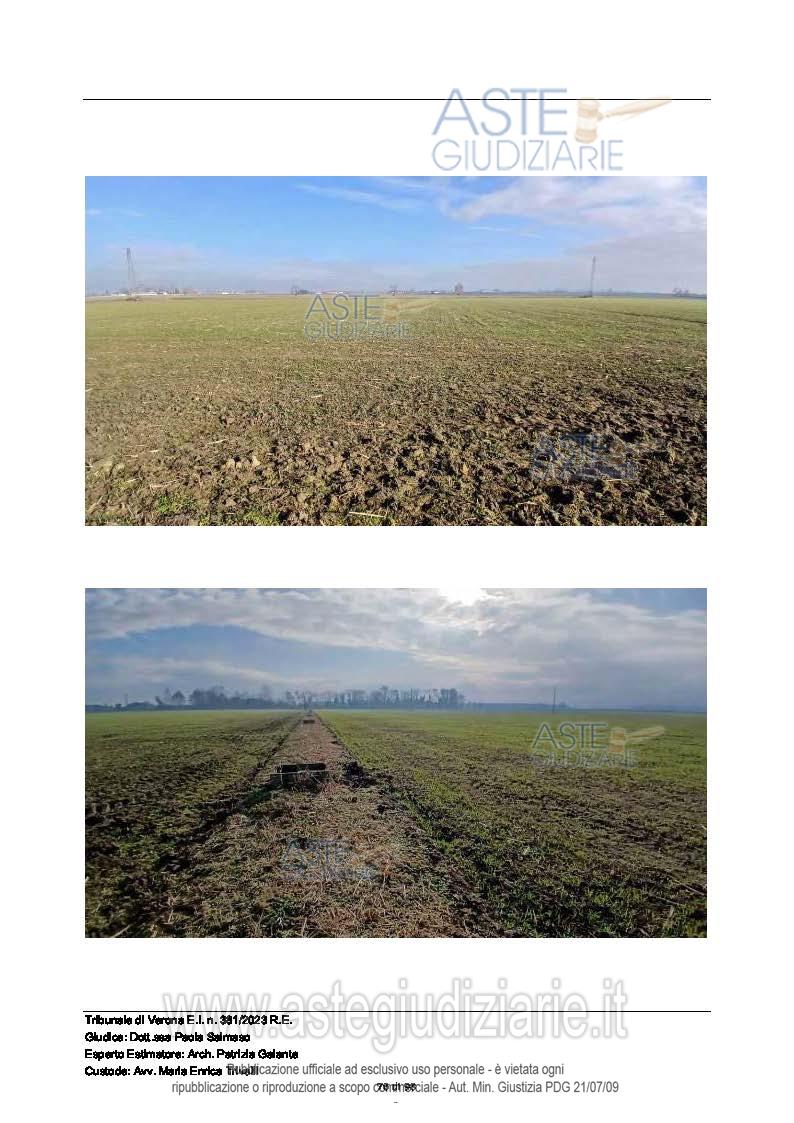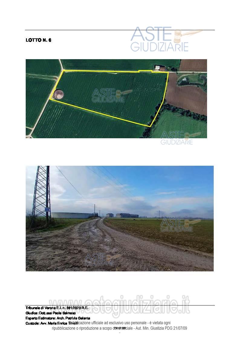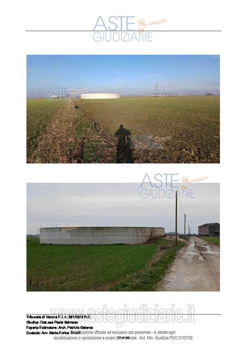 Vendita all'asta Senza incanto, con gara telematica sincrona mista - LOTTO 6: Tra i Comuni di Povegliano Veronese (VR) e Vigasio (VR), Località Ronchi, piena proprietà di fondo rustico della superficie catastale complessiva pari a 58.157 mq. in parte occupato da vasca da digestato non palabile. Prezzo base € 432.000,00 (offerta minima € 324.000,00). Data vendita 04/02/2026 ore 14:30. Giudice Dott. Paola Salmaso. Professionista delegato alla vendita Not. Giovanni Calvelli - Email "segreteria@notaiveronesiassociati.it"; Tel. 0458530137. Custode Giudiziario Avv. Maria Enrica Trivelli - Email "mariaenrica.trivelli@gmail.com"; Tel. 045592599. Rif. Tribunale di Verona - Espropriazione immobiliare (cartabia) n. 381/2023