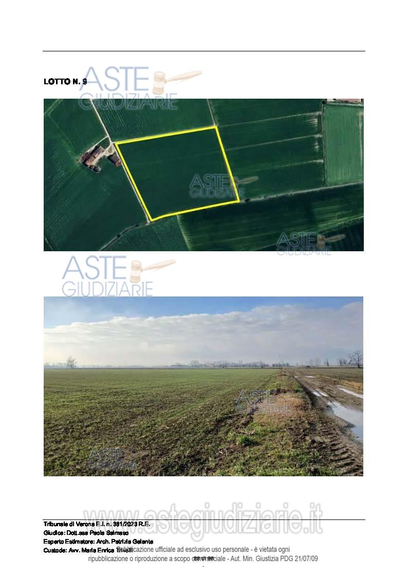 Vendita all'asta Senza incanto, con gara telematica sincrona mista - LOTTO 9: In Comune di Povegliano Veronese (VR) , Località Carbonara/Ronchi, piena proprietà di fondo rustico della superficie catastale complessiva pari a 75.477 mq. Prezzo base € 270.000,00 (offerta minima € 202.500,00). Data vendita 04/02/2026 ore 14:30. Giudice Dott. Paola Salmaso. Professionista delegato alla vendita Not. Giovanni Calvelli - Email "segreteria@notaiveronesiassociati.it"; Tel. 0458530137. Custode Giudiziario Avv. Maria Enrica Trivelli - Email "mariaenrica.trivelli@gmail.com"; Tel. 045592599. Rif. Tribunale di Verona - Espropriazione immobiliare (cartabia) n. 381/2023