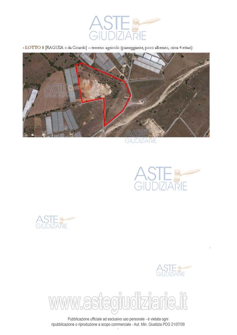 Vendita all'asta Senza incanto, con gara telematica sincrona mista - LOTTO 5: PIENA PROPRIETA' DI TERRENO AGRICOLO SITO NEL COMUNE DI RAGUSA IN C/DA CICARDO (O ANCHE IMPERATORE).COSTITUITO DA 5 PARTICELLE CATASTALI DI COMPLESSIVI MQ 39.139, IN BUONA PARTE PIANEGGIANTE, POCO ALBERATO E PARZIALMENTE DELIMITATO. Prezzo base € 56.250,00 (offerta minima € 42.188,00). Data vendita 31/03/2026 ore 12:30. Professionista delegato alla vendita Avv. Valentina Covato - Email "valentinacovato@hotmail.it"; Cell. 3336564920. Custode Giudiziario Avv. Valentina Covato - Email "valentinacovato@hotmail.it"; Cell. 3336564920. Rif. Tribunale di Ragusa - Esecuzione immobiliare post legge 80 n. 227/2021