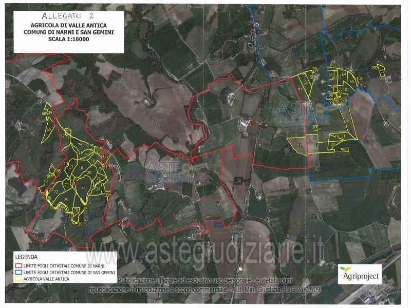 Vendita all'asta Senza incanto, con gara telematica sincrona mista - LOTTO 5: TERRENI AGRICOLI estesi su di una superficie complessiva pari ad ha 12 circa siti nei Comuni di San Gemini (TR) e Narni (TR), in loc. Valleantica e censiti al CT del Comune di San Gemini (TR) al foglio 24 partile 18 - 19 - 20 - 21 - 66; e al CT del Comune di Narni (TR) al foglio 10 partila 41.-FABBRICATI (riuniti in un complesso di tipologia rurale con manufatti e fabbricati generalmente fatiscenti) identificati al NCEU del Comune di San Gemini (TR) al foglio 24 part.lla 66 subalterni 23-4-5-6-7.-. Prezzo base € 156.975,00 (offerta minima € 117.731,25). Data vendita 05/03/2026 ore 11:00. Professionista delegato alla vendita Dott. Patrizia Cianchini - Email "STUDIO.CIANCHINI@GMAIL.COM"; Tel. 0744403728. Rif. Tribunale di Terni - Fallimentare (nuovo rito) n. 19/2022