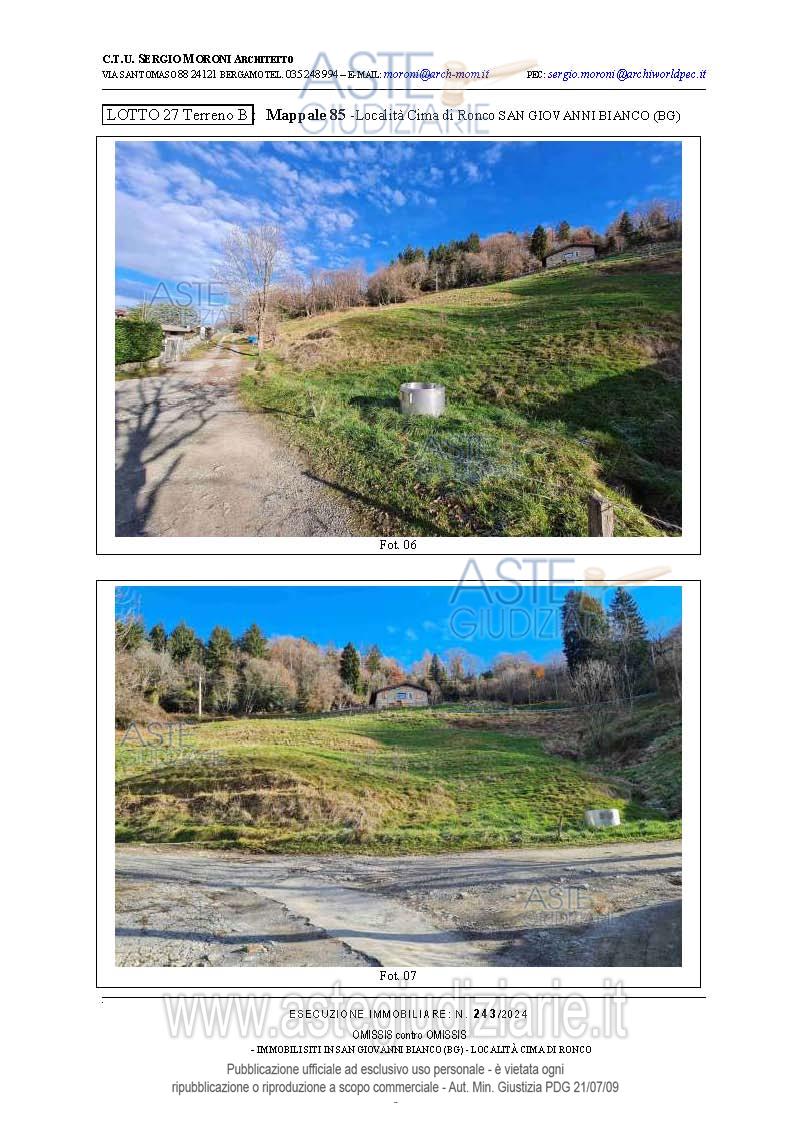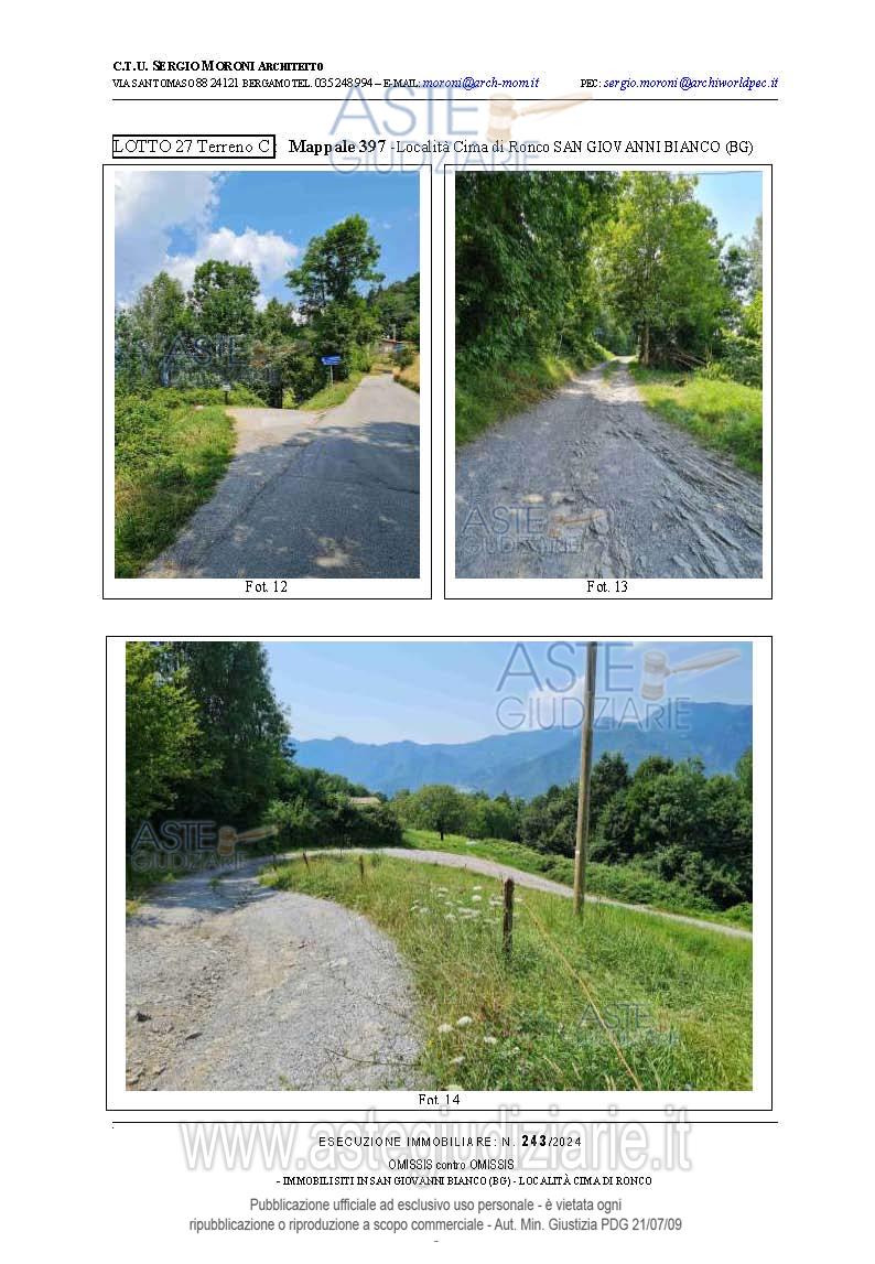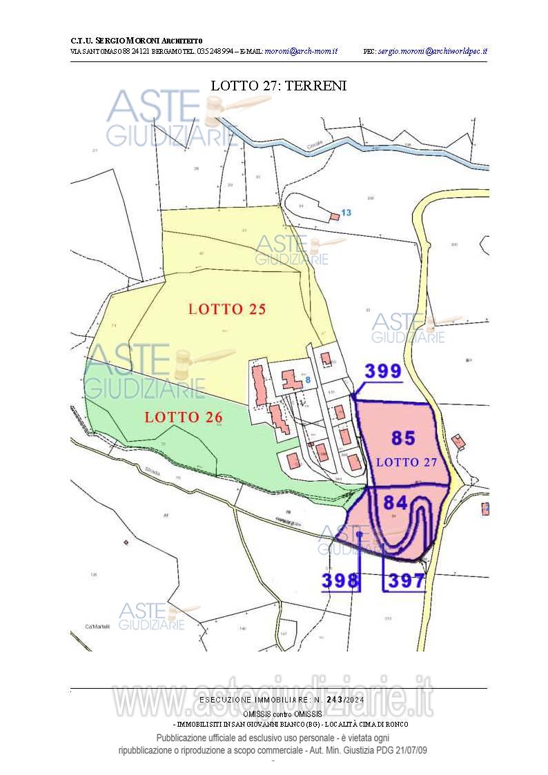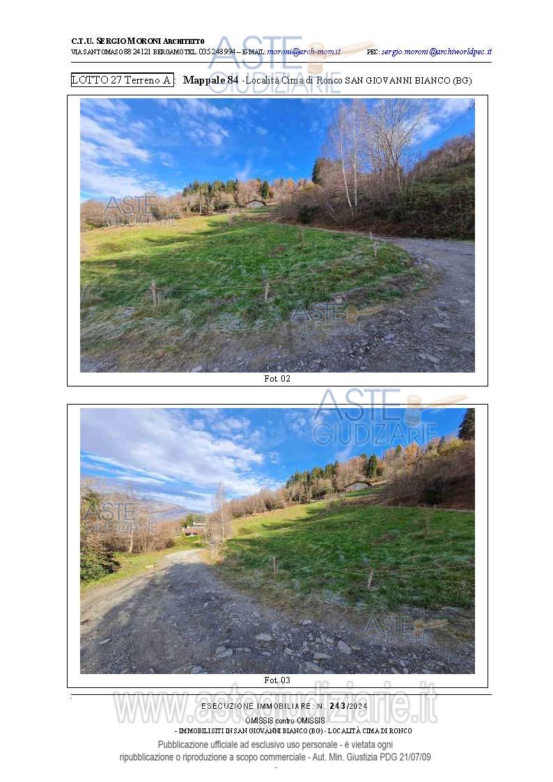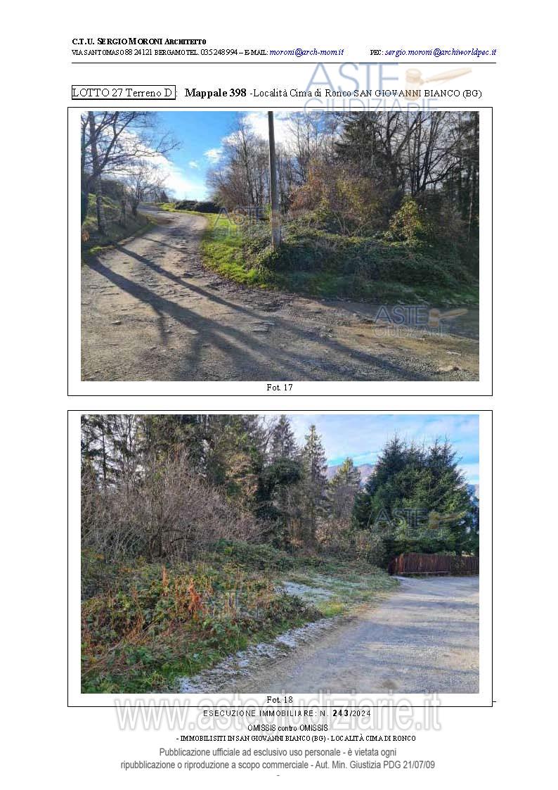 Vendita all'asta Senza incanto, con gara telematica asincrona - LOTTO 27: Lotto di terreno della superficie complessiva di mq.8.805 a destinazione agricola/boschiva. Prezzo base € 16.875,00 (offerta minima € 12.656,25). Data inizio operazioni di vendita: 26/03/2026 ore 15:00. Professionista delegato alla vendita Avv. Francesca Donati - Email "francesca.donati@dfgs.it"; Tel. 0352285711. Custode Giudiziario Avv. Francesca Donati - Email "francesca.donati@dfgs.it"; Tel. 0352285711. Rif. Tribunale di Bergamo - Espropriazione immobiliare (cartabia) n. 243/2024