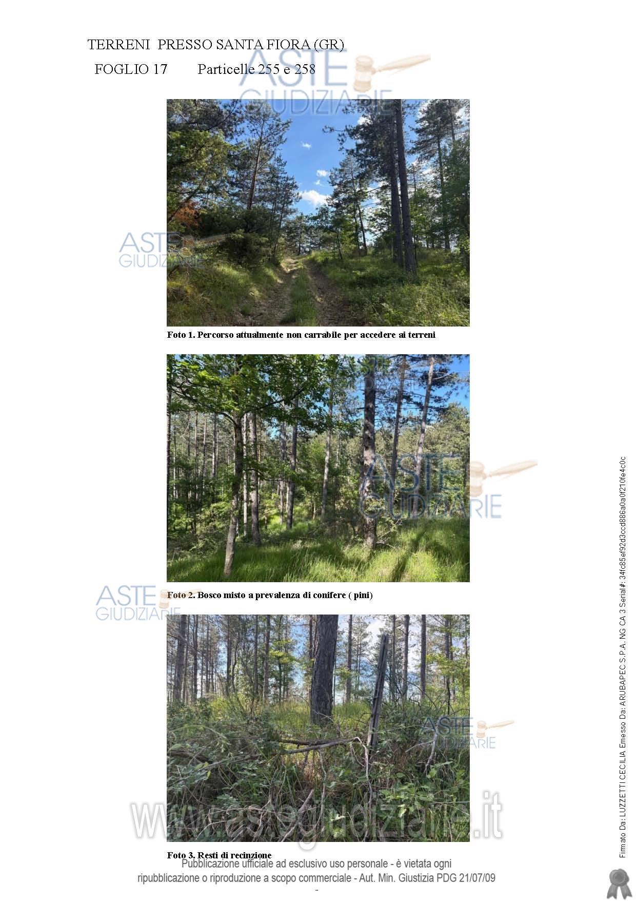 Vendita all'asta Senza incanto, con gara telematica asincrona - LOTTO 7: Quota pari all’intero del diritto di piena proprietà su terreni siti nel Comune di Santa Fiora, Loc. Saragiolo, censiti al Catasto Terreni del Comune di Santa Fiora Foglio 17, particella 255, qualità seminativo, classe 3, superficie totale mq 33.160, reddito dominicale euro 27,40 reddito agrario Euro 42,81 e al Foglio 17, particella 258, qualità seminativo, classe 3, superficie totale mq 15.080, reddito dominicale Euro 12.46 Reddito Agrario Euro 19,47. Prezzo base € 11.600,00 (offerta minima € 8.700,00). Data inizio operazioni di vendita: 29/04/2026 ore 09:30. Professionista delegato alla vendita Dott. Silvia Signori - Email "silviasignori68@virgilio.it"; Cell. 3472986024; Tel. 05641792054. Custode Giudiziario Lucia Ghelli - Email "ivggrosseto@astagiudiziaria.com"; Cell. 3426598791. Rif. Tribunale di Grosseto - Espropriazione immobiliare (cartabia) n. 7/2024